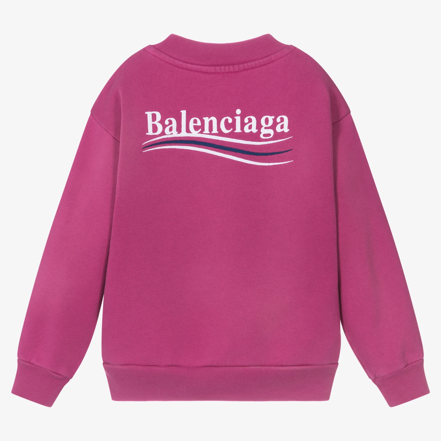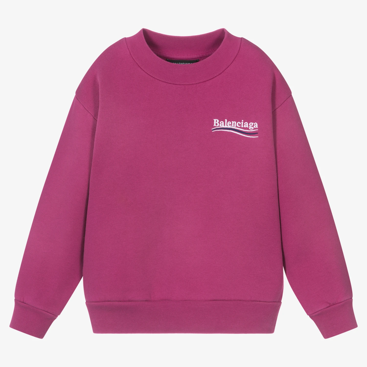 Sportswear meets luxury with this fuchsia pink sweatshirt for boys and girls, by luxury designer Balenciaga. Made in comfortable cotton jersey, it has the brand’s iconic Political Campaign logo embroidered on the front and back, and has a casual crew neckline.