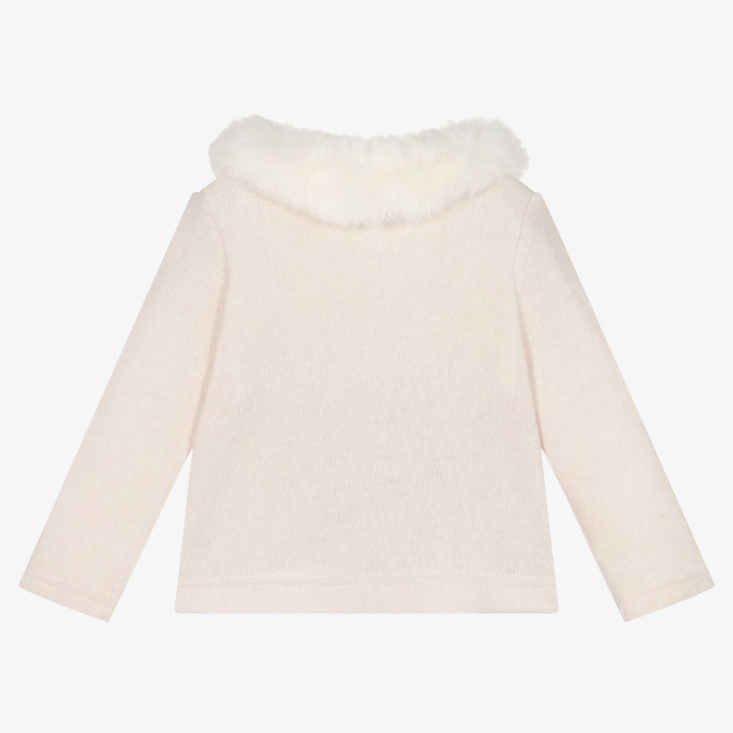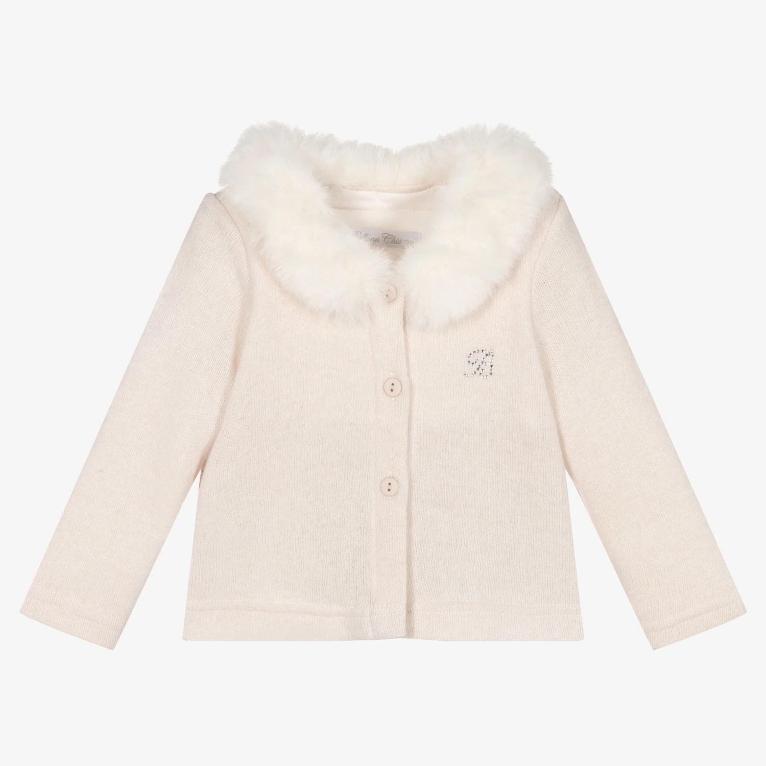 In a lovely shade of pale beige, this cardigan for girls is by Balloon Chic. It is knitted in a luxuriously soft wool and cashmere blend, with a plush faux fur collar adding a touch of elegance. Partially lined in jersey for comfort, it has front button fastenings and a sparkling diamanté logo on the chest.