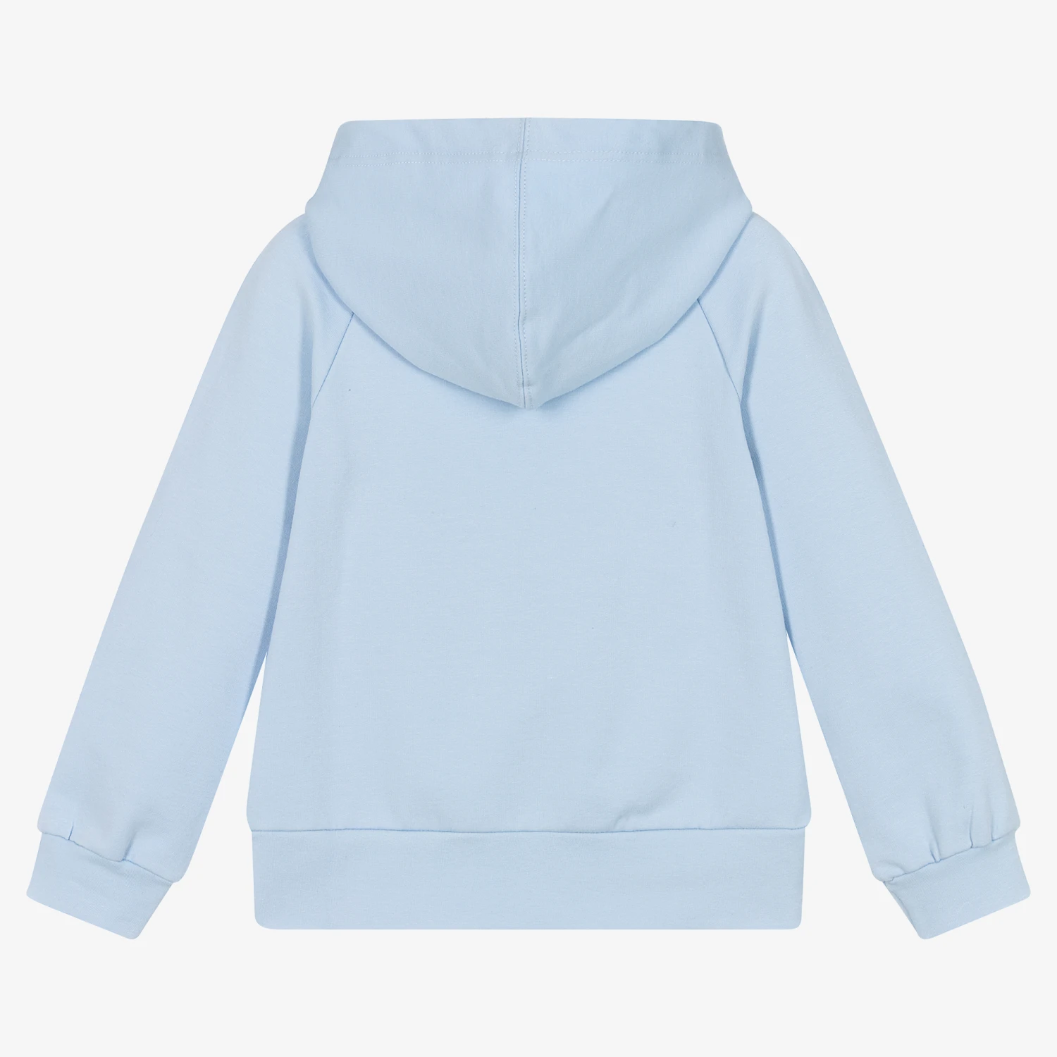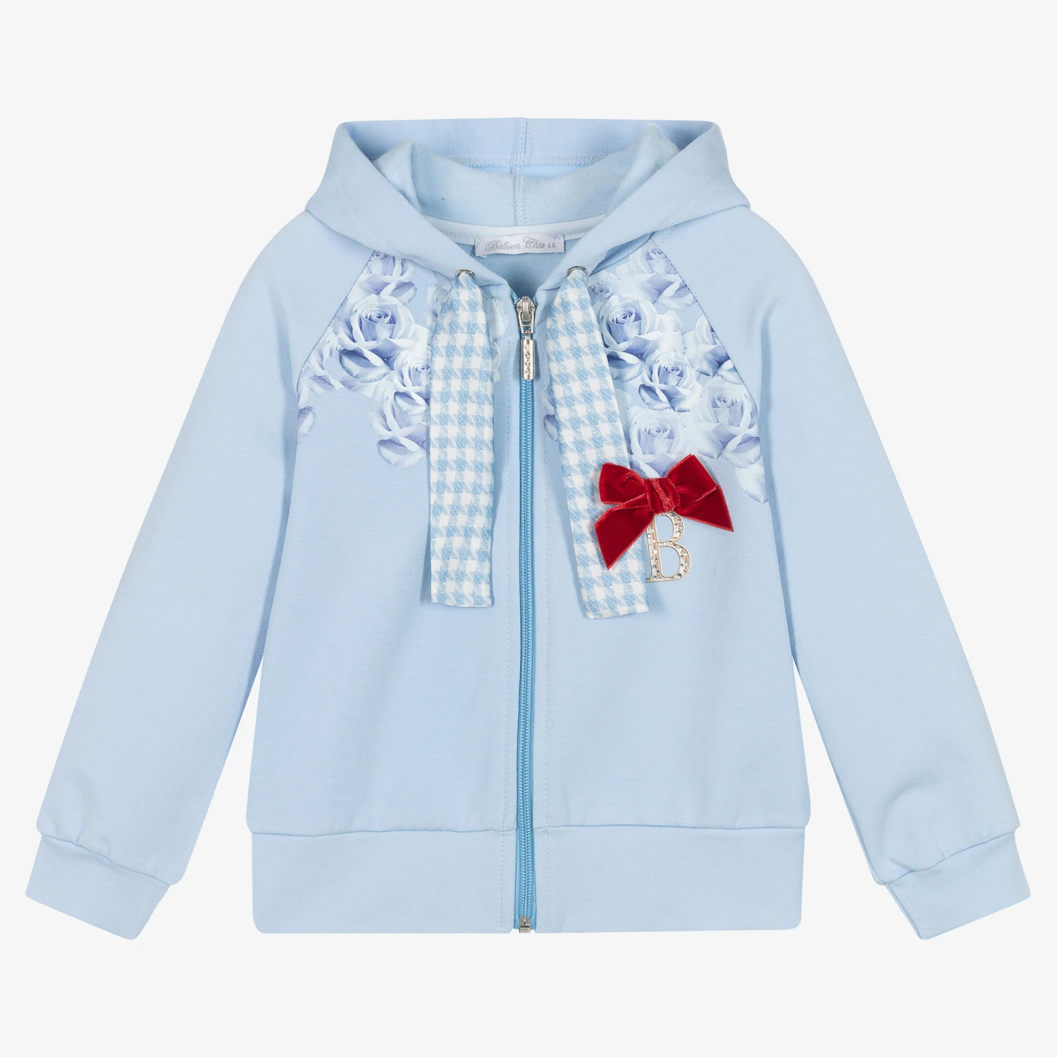 A blue zip-up hoodie for girls by Balloon Chic, made from soft cotton jersey. Cute for layering, this top has a zip fastening, a rose print, and faux satin drawstrings in a houndstooth pattern. There is a red velvet bow on the chest, with a diamanté ‘B’ logo.