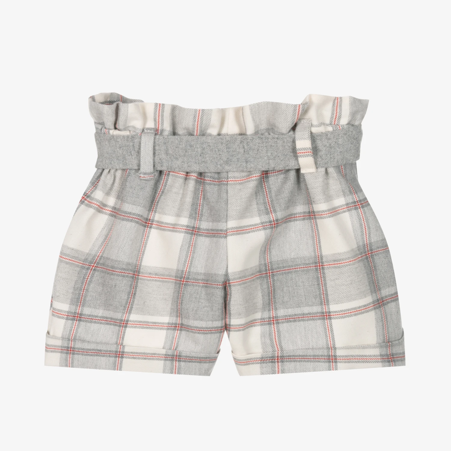 Lovely grey shorts for girls by Balloon Chic, made in a soft cotton weave. These shorts have a red check pattern, a stylish paperbag waist and a matching tie belt.