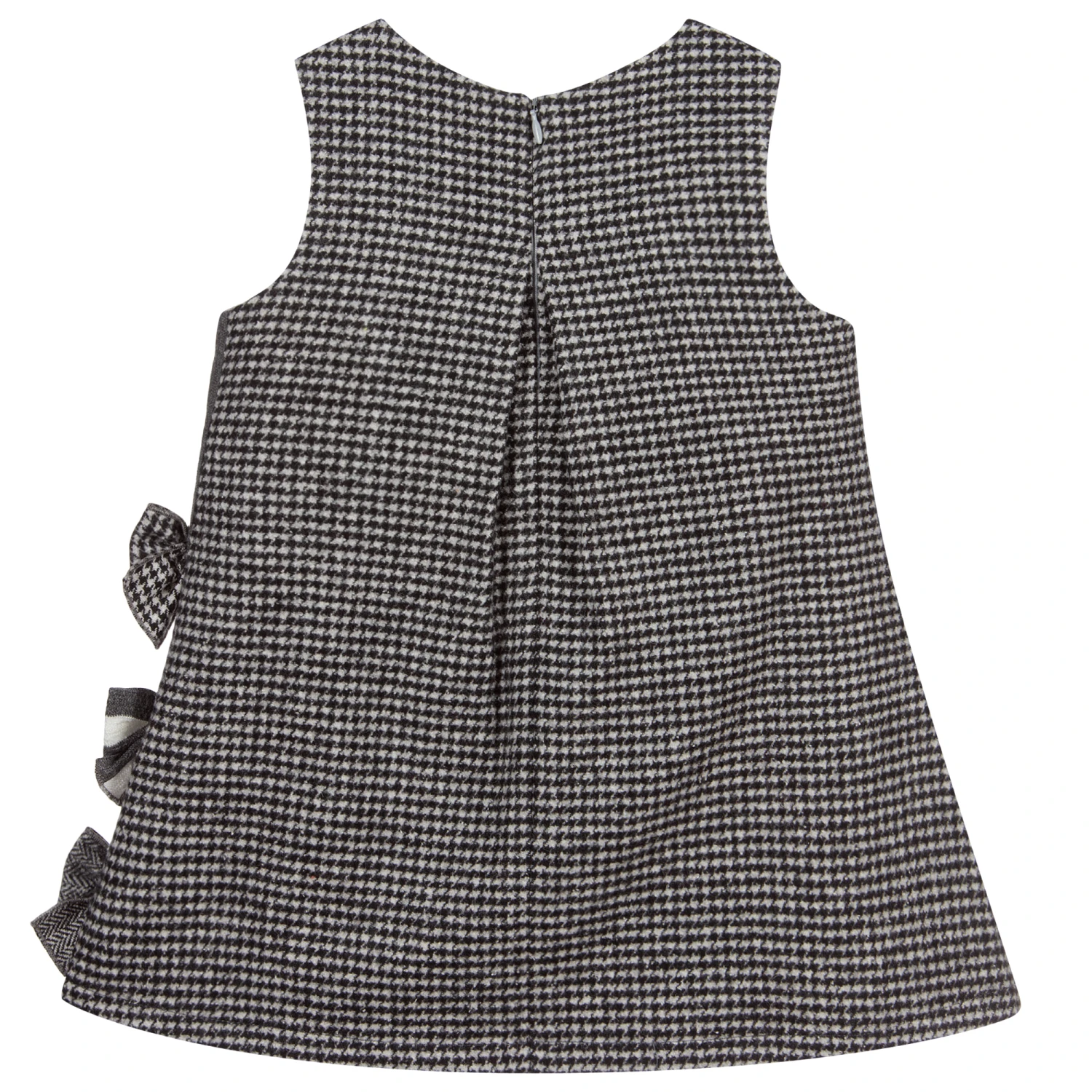 Girls grey patterned dress by Balloon Chic. It has a grey and white stripe down one side with three bows, and is fully lined in 100% cotton.