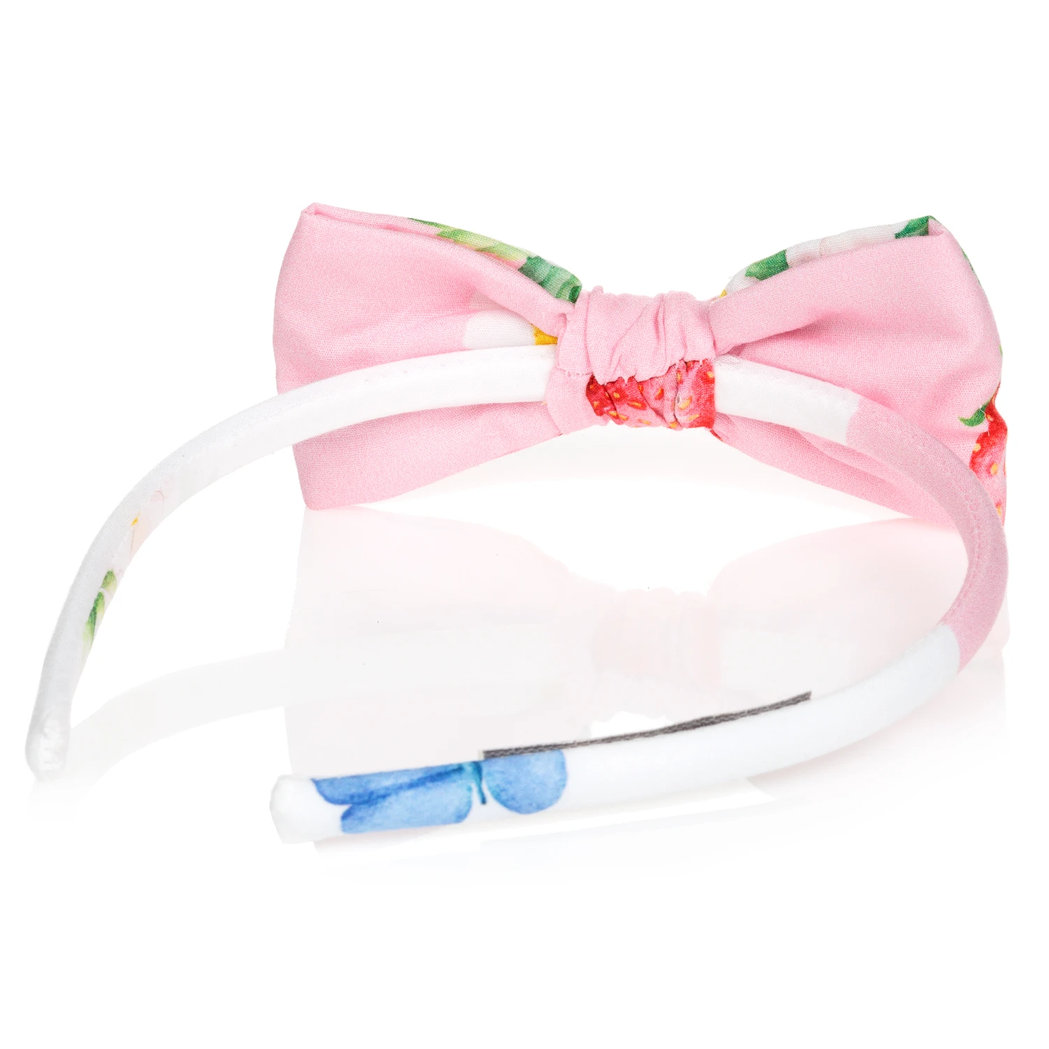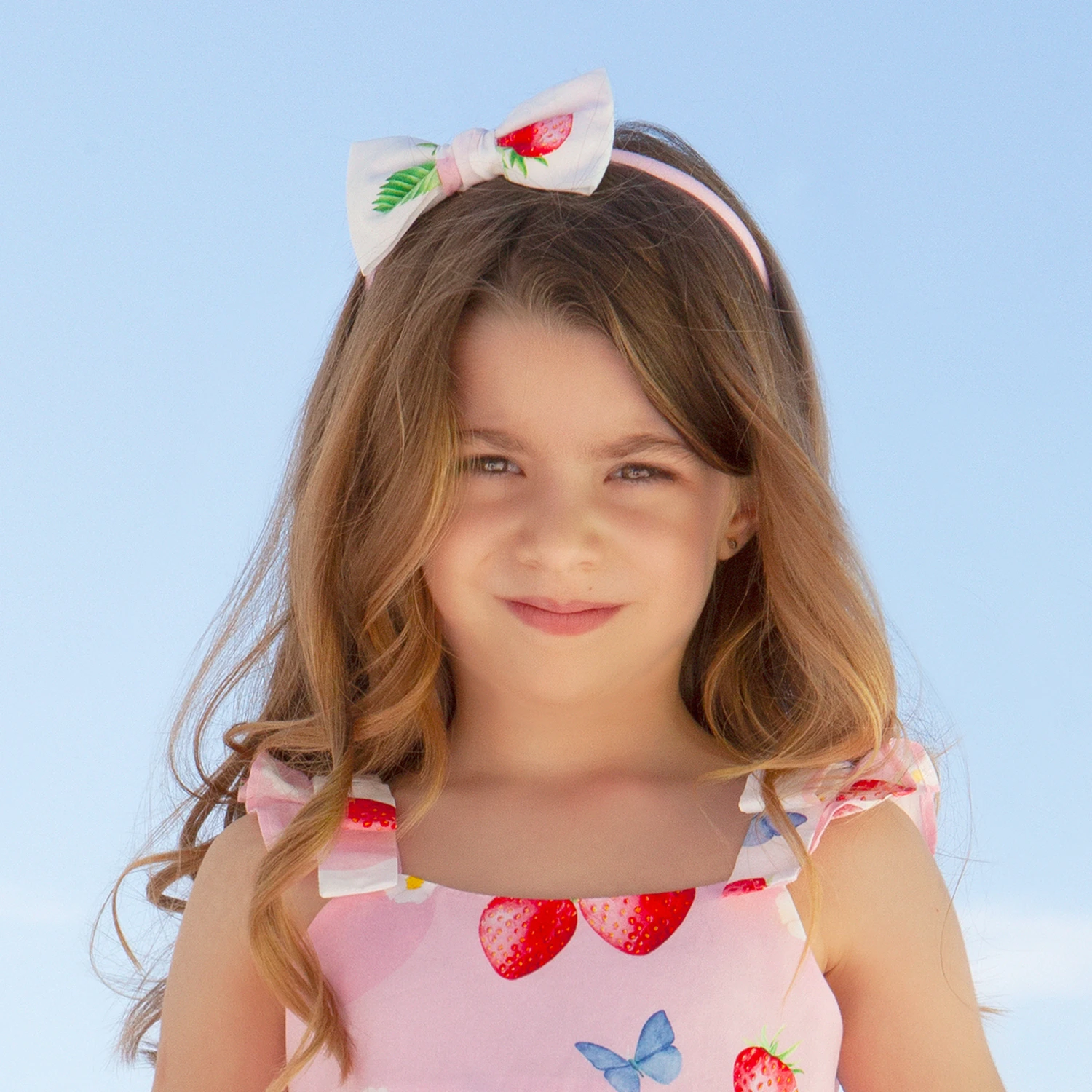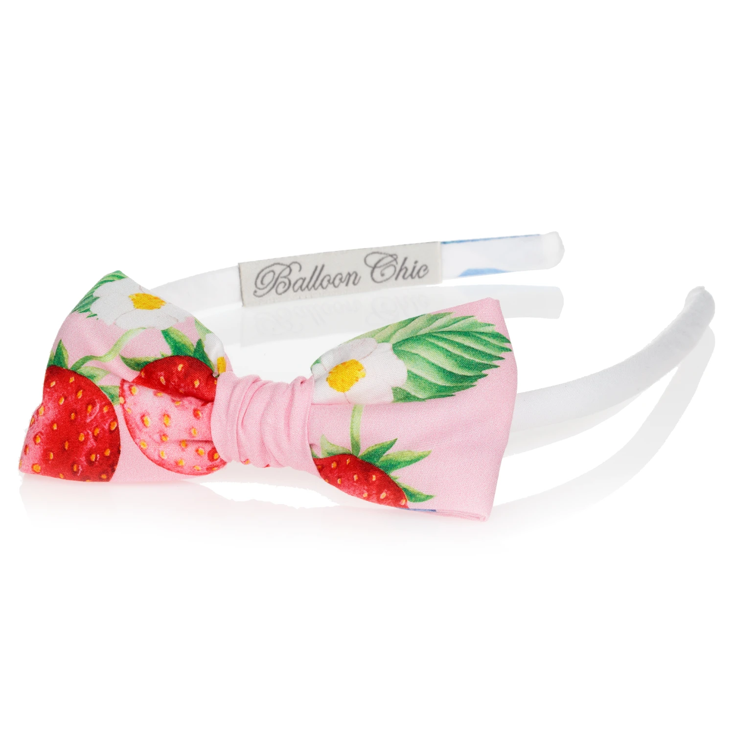 White and pink Balloon Chic hairband for girls. It has a cotton bow decoration and is patterned with strawberries, daisies and the brand’s name.