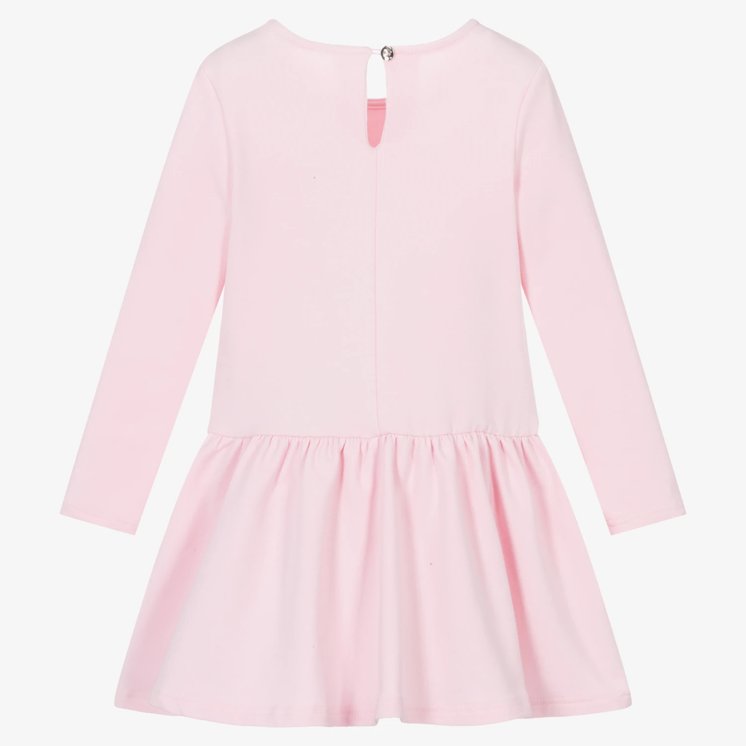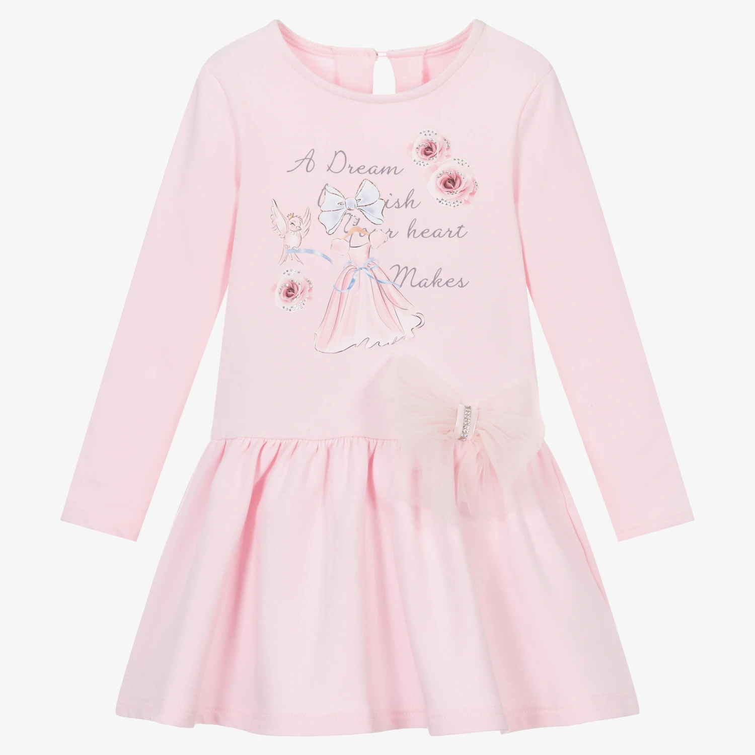 Girls pale pink dress by Balloon Chic, made in mid-weight cotton jersey. With a super soft fleecy inside for added comfort, this casual dress has a slogan print on the front with pretty flowers and a dress embellished with diamantés for an eye-catching finish. A single button fastening secures the keyhole detail on the back.