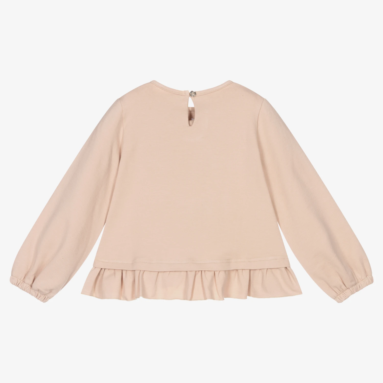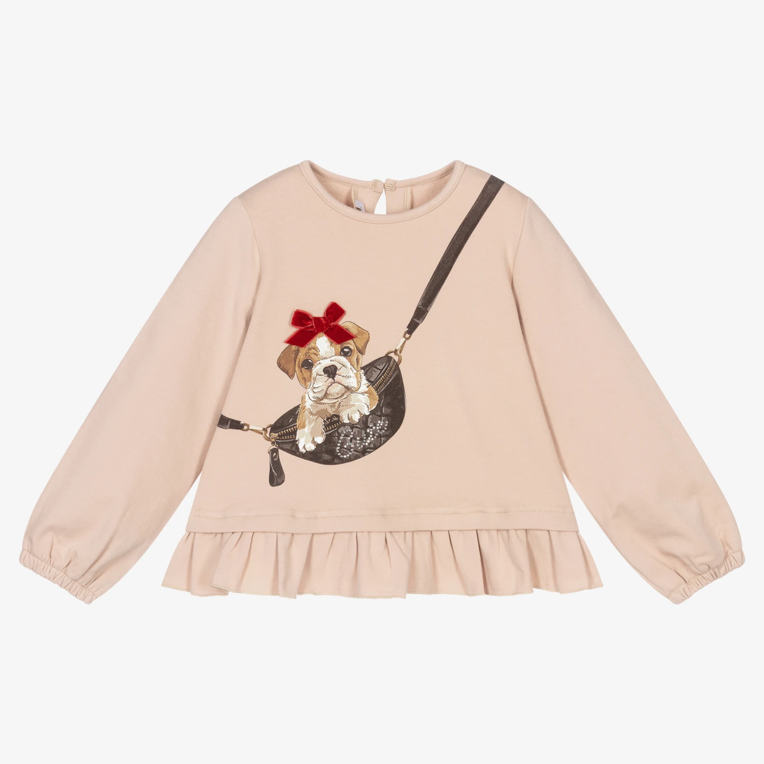 Beige-pink sweatshirt for girls by Balloon Chic, with a cute dog in a handbag printed on the front. It is made in mid-weight cotton jersey, with a warm fleecy inside. It has a ruffled hem, elasticated cuffs and a single back button fastening.