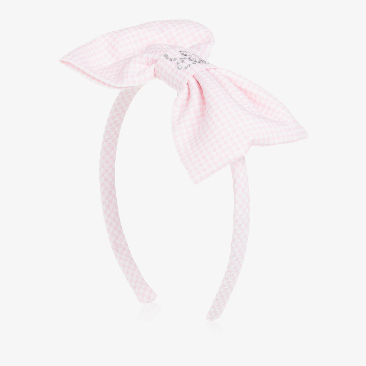 A pretty pink and white gingham hairband for girls by Balloon Chic. The slim, flexible band is covered in cotton fabric and has a matching fabric bow on the top with a diamanté logo in the centre.