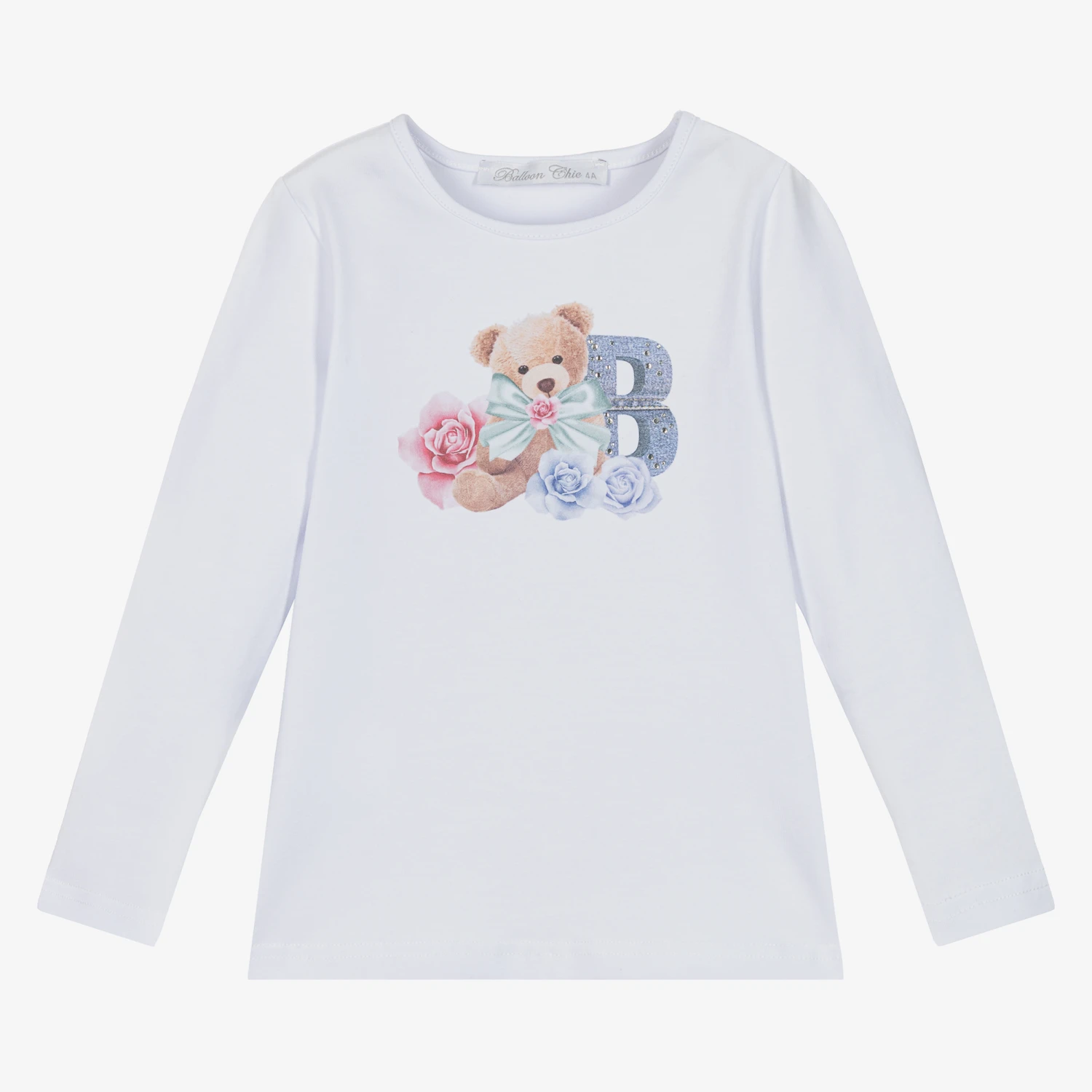 A casual white T-shirt for girls by Balloon Chic, made from super soft cotton jersey. This tee has a cute bear and rose print with a diamanté ‘B’ logo printed on the front.