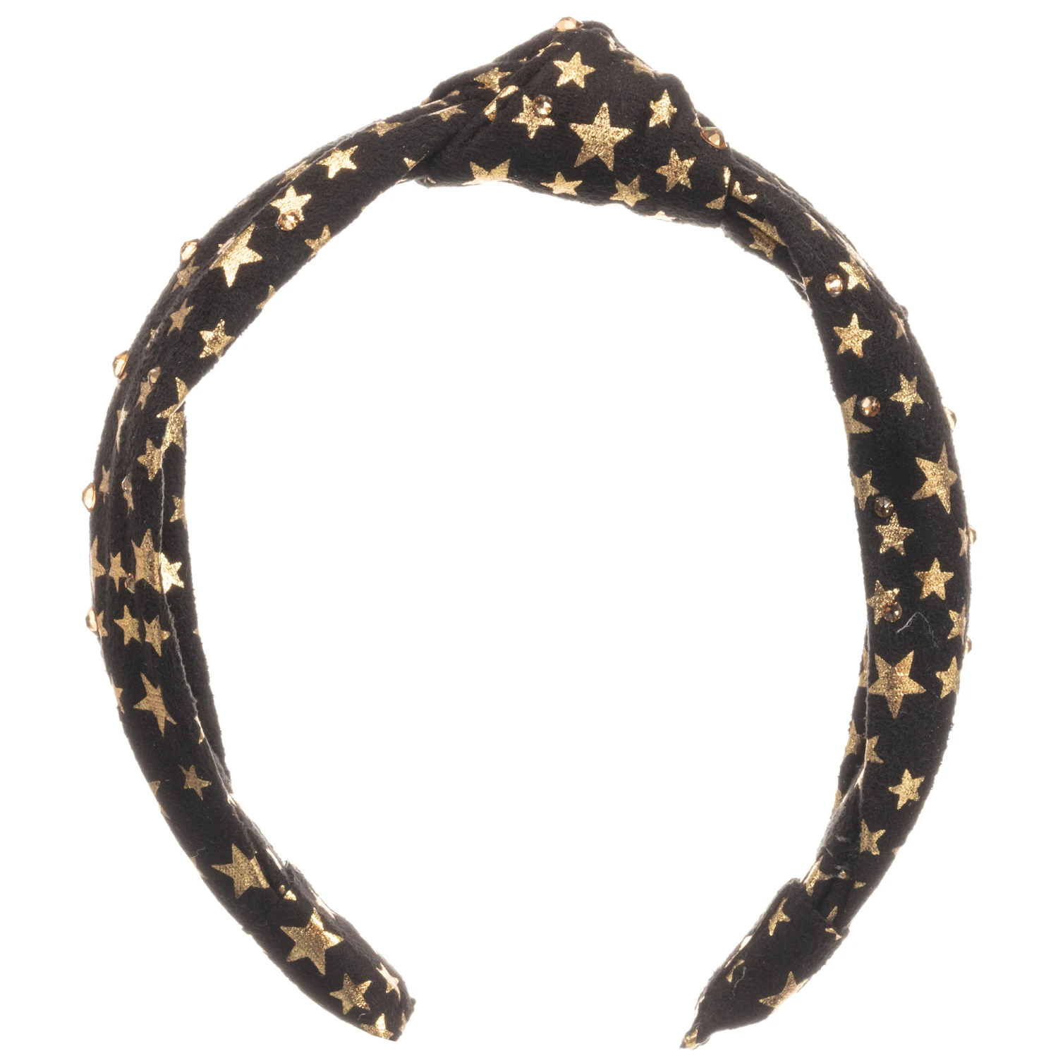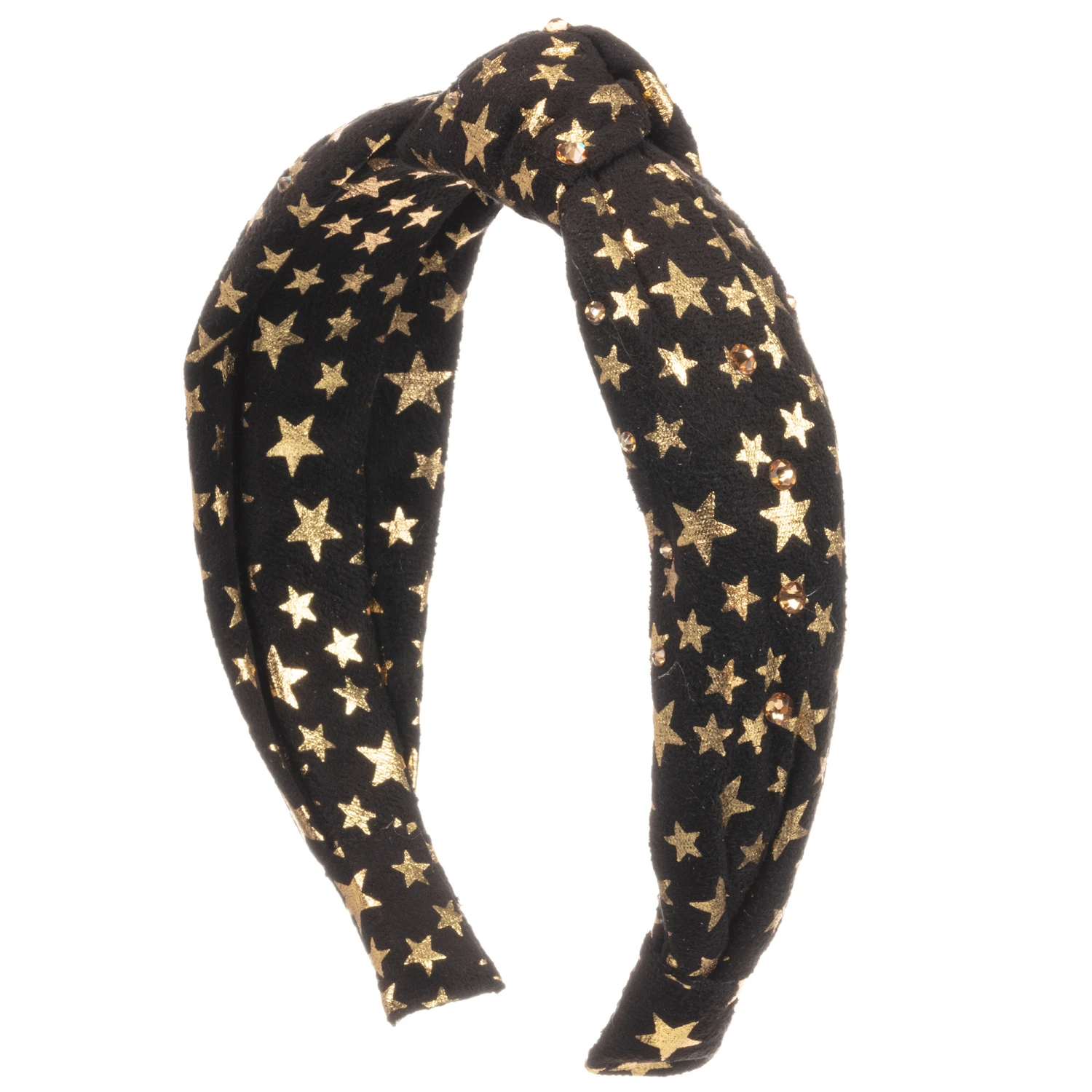 An eye-catching black hairband for girls by New York designer, Bari Lynn. Made in faux suede with a top knot, it is patterned with shiny gold stars and sparkling crystals, with a flexible band below.