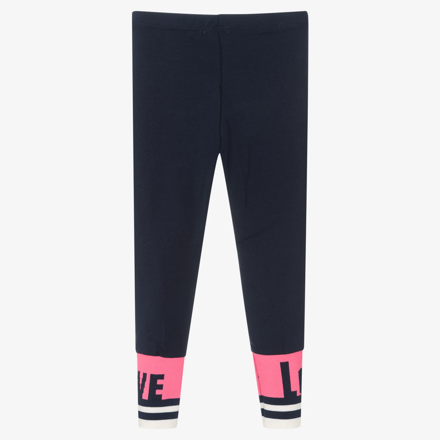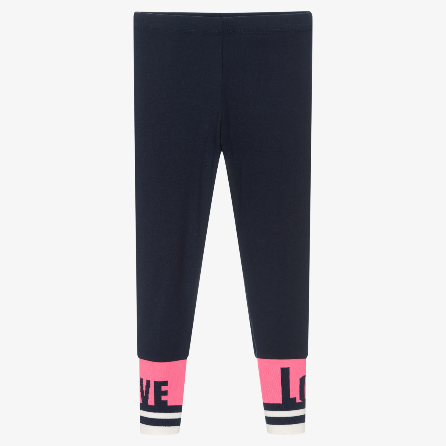 Navy blue leggings for girls by Billieblush, made in soft and stretchy jersey. The ankle cuffs are ribbed with jacquard sparkly stripes and “LOVE” on neon pink for a fun finish on a classic piece.