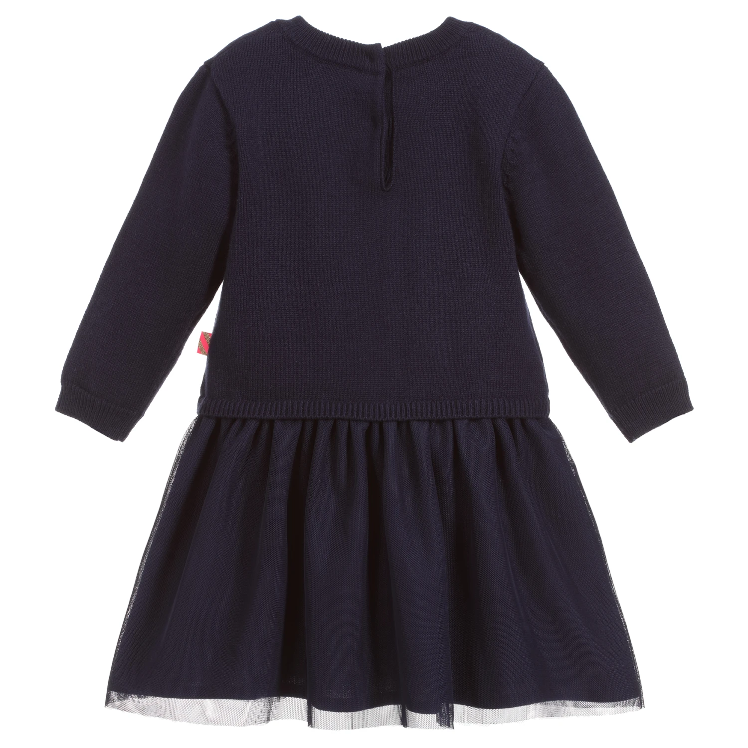 Sweet navy blue dress for little girls by Billieblush. It has a knitted bodice with a cute unicorn cat on the front. The skirt is made in a double layer of soft tulle, with a lightweight jersey lining.