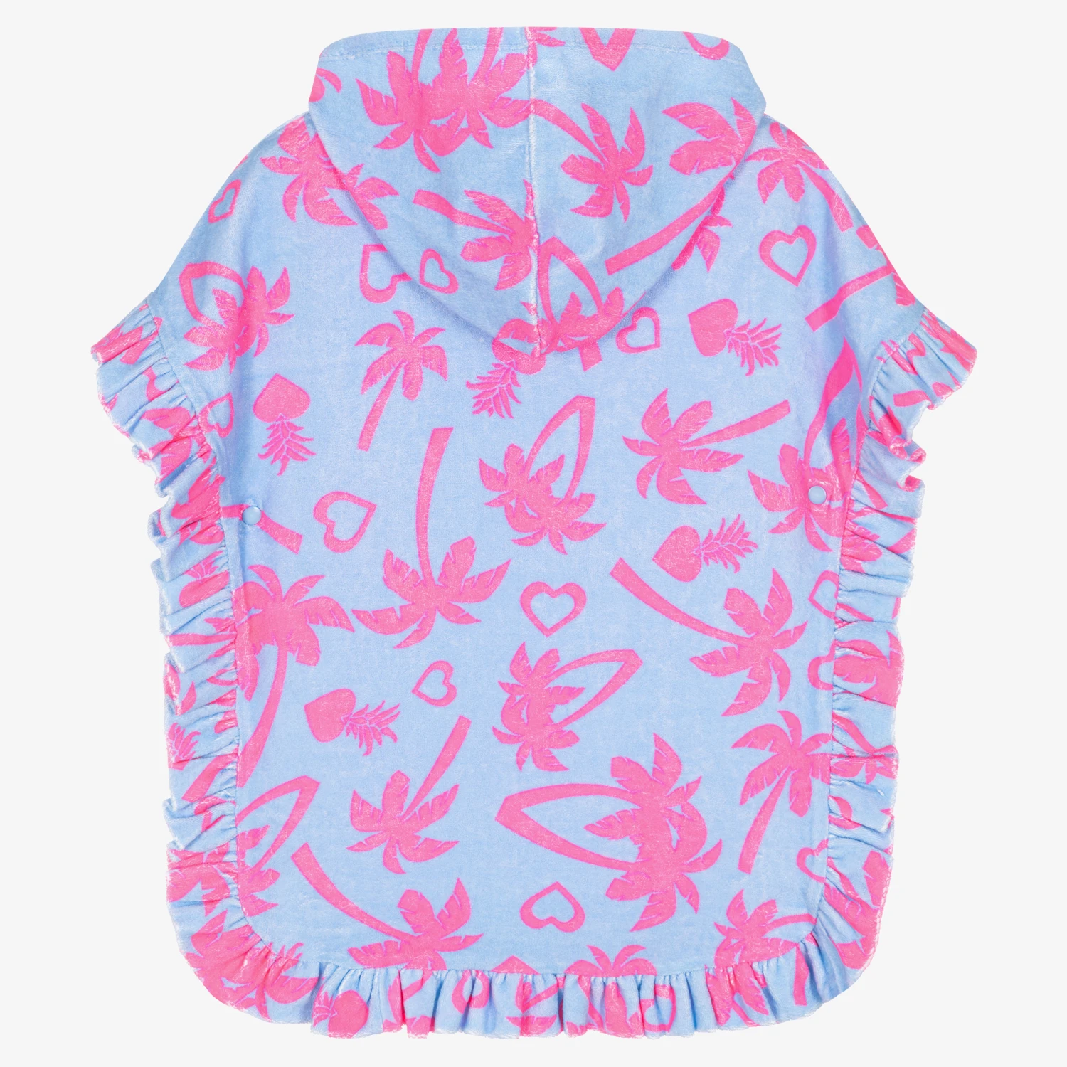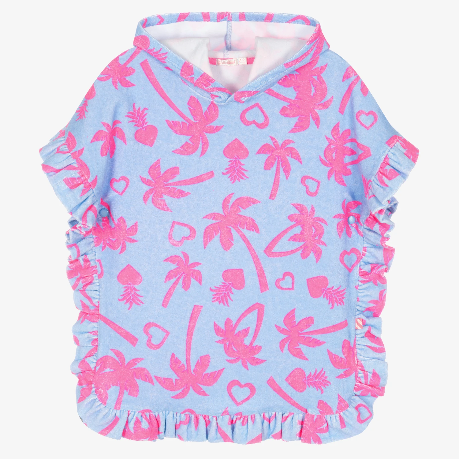 Eye-catching blue hooded towel for girls by Billieblush, with a neon pink palm tree, heart and pineapple pattern. Made in soft cotton terry towelling, with a frilled trim and popper fastenings on the sides to create arm holes. Cosy for bathtime or use as a beach cover-up, it slips on easily over the head.