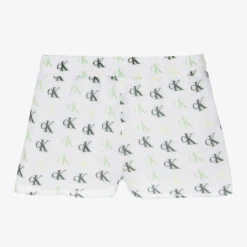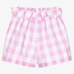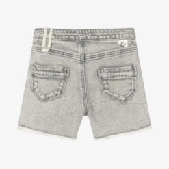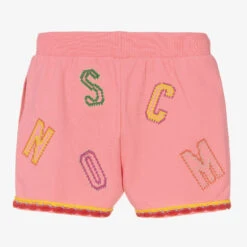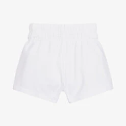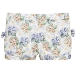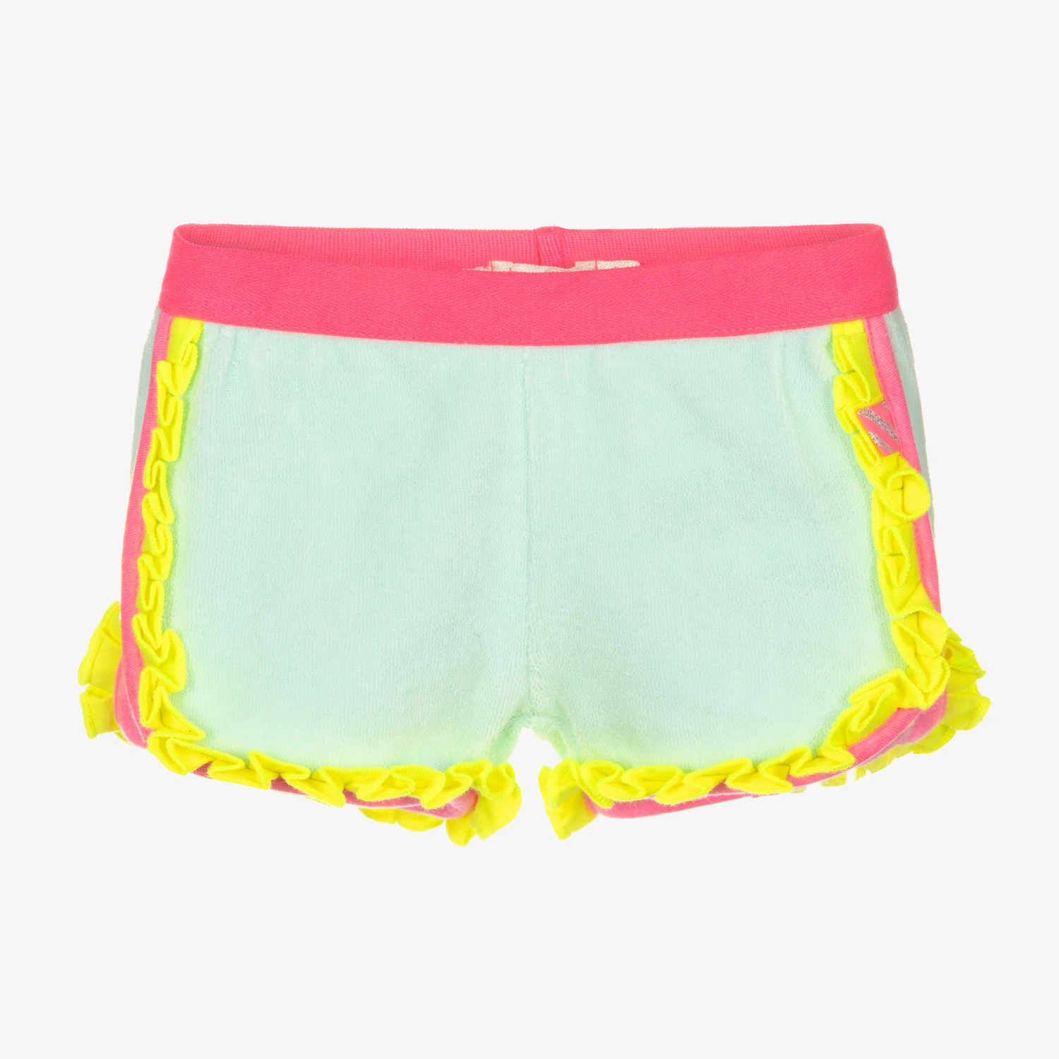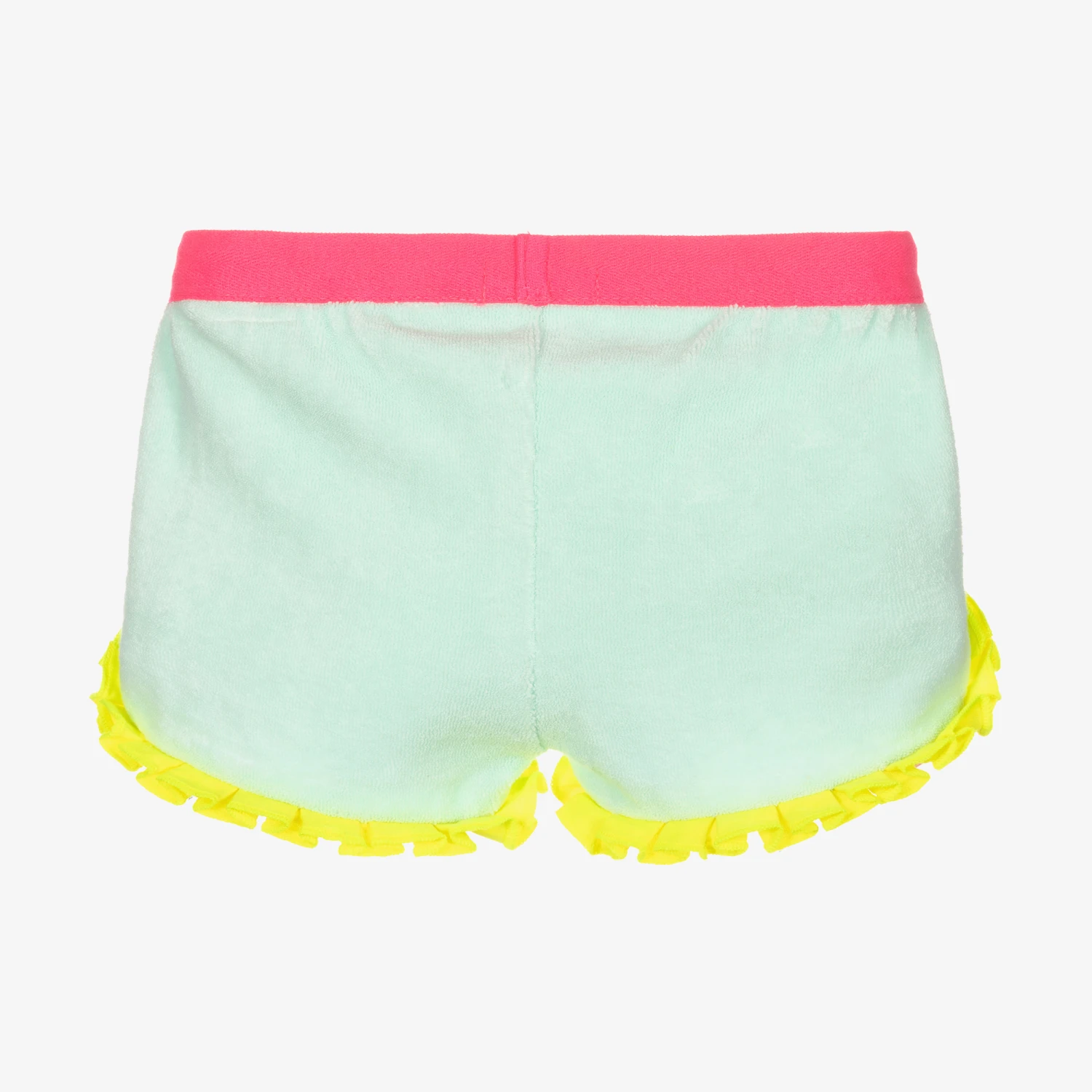 Pale blue shorts for little girls by Billieblush. Made with soft and stretchy cotton towelling, they have neon pink trims, neon yellow frills, and a comfortable, elasticated waistband.