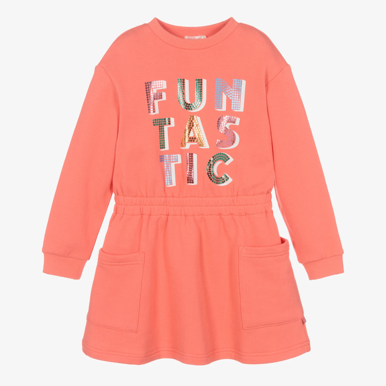 Coral pink cotton jersey dress for girls by Billieblush. This fun bright dress has an elasticated waist and two pouch pockets for a relaxed look. There is a fun colourful slogan printed on the front in a sparkly sequin effect.