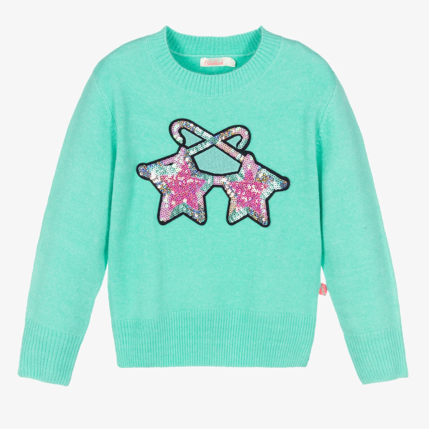 Super cute sea green sweater for girls by Billieblush, knitted from soft acrylic. It has a playful sequin sunglasses design on the front in shades of pink, green, and ivory.
