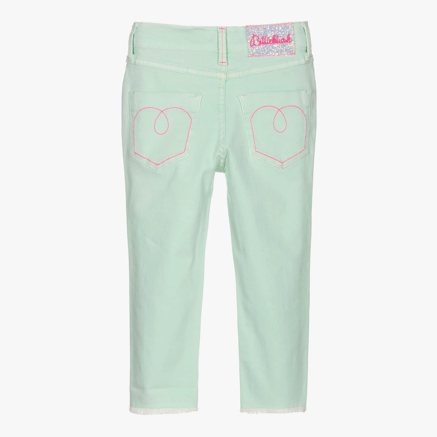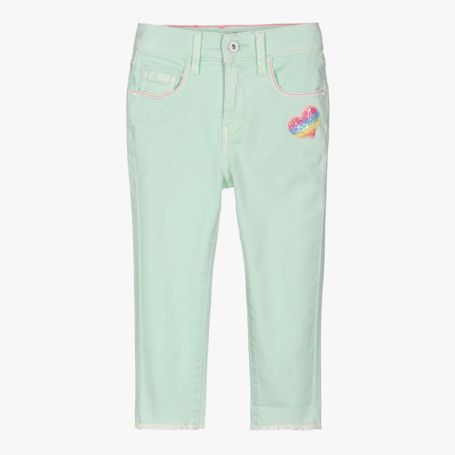 Pale blue jeans for girls by Billieblush. Made with soft and stretchy, lightweight denim, they have neon pink contrast stitching on the pockets, a glittery padded heart in rainbow colours on the front, and a sparkly logo badge on the back. There is a useful adjustable waist, and a front button and zip fastening.