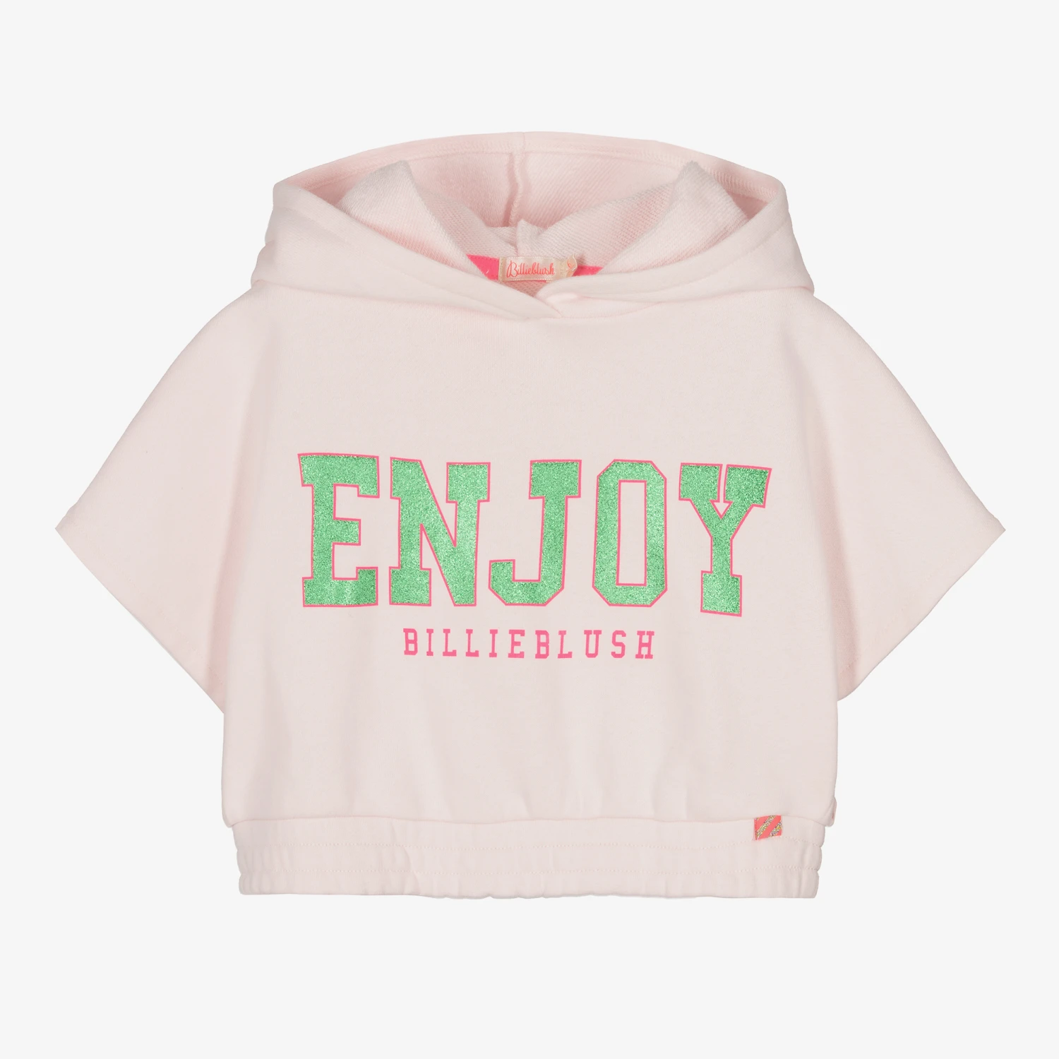 Pale pink sweatshirt for girls by Billieblush, made in comfortable cotton jersey. It has an eye-catching, varsity look with a glittery green and neon pink ‘ENJOY’ slogan printed on the front, and the brand’s pink logo below. The short, seamless sleeves that are open to the waist, the large cosy hood and an elasticated waistband create a cool, slouchy fit.