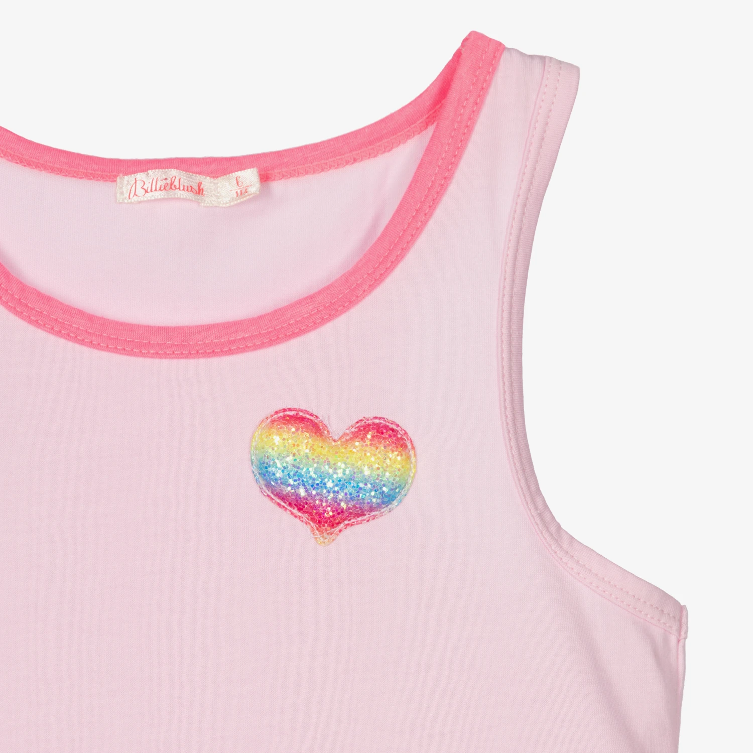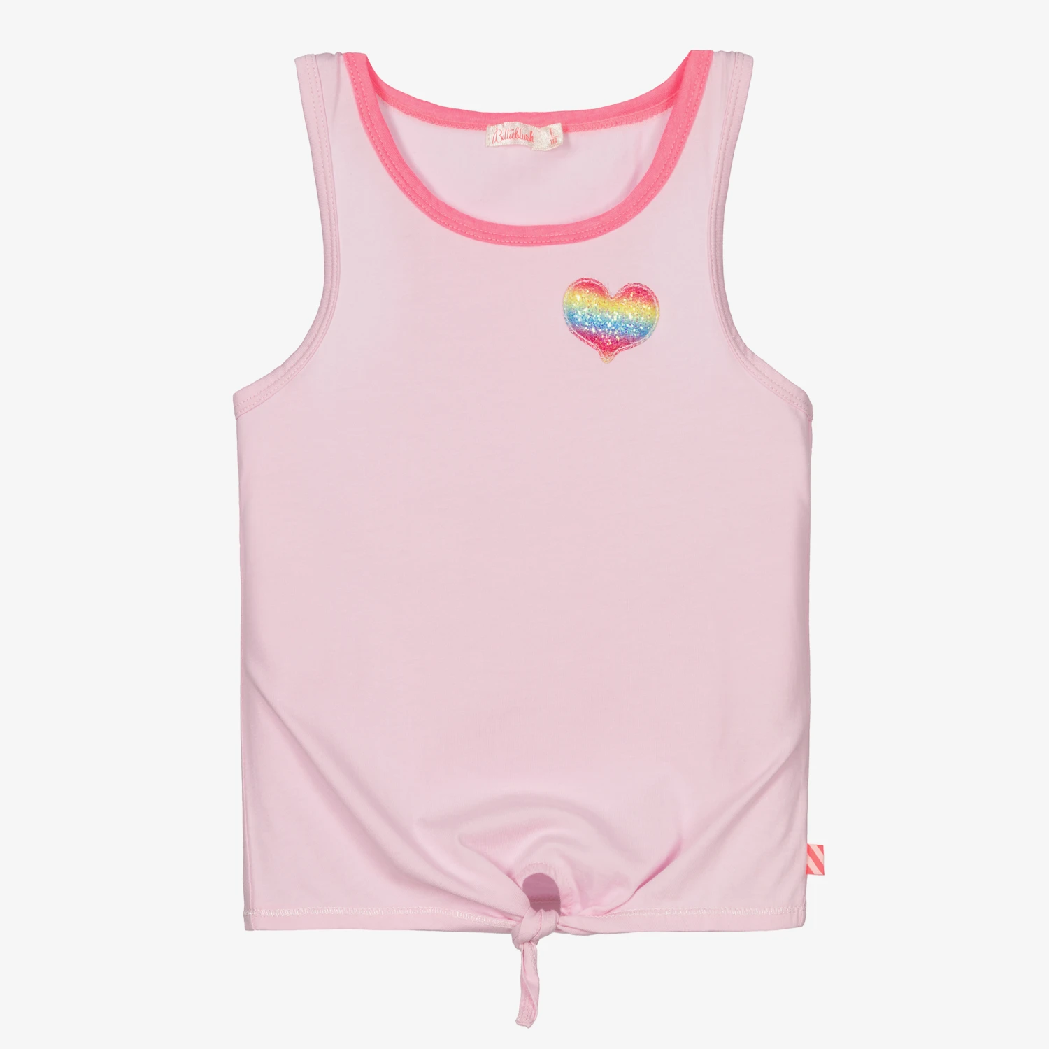 Pale pink vest top for girls by Billieblush. Made with soft and stretchy cotton jersey, it has a neon pink neckline, a tie detail on the hem, and a glittery padded heart in rainbow colours on the chest.