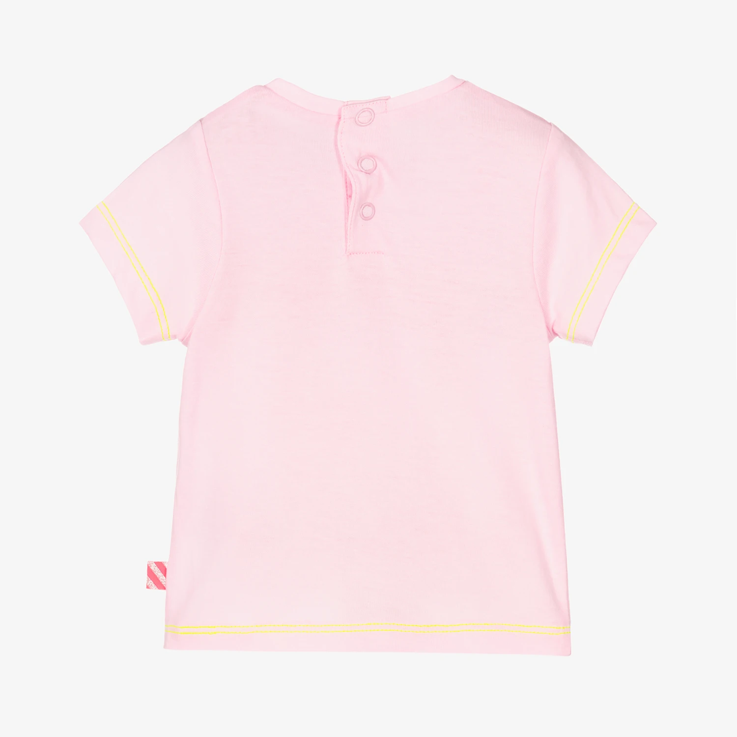 Pretty pale pink T-shirt for girls by Billieblush, made in soft cotton jersey. Printed with a fun, glittery swan on a surfboard, it has a neon pink slogan print and neon yellow contrast stitching.