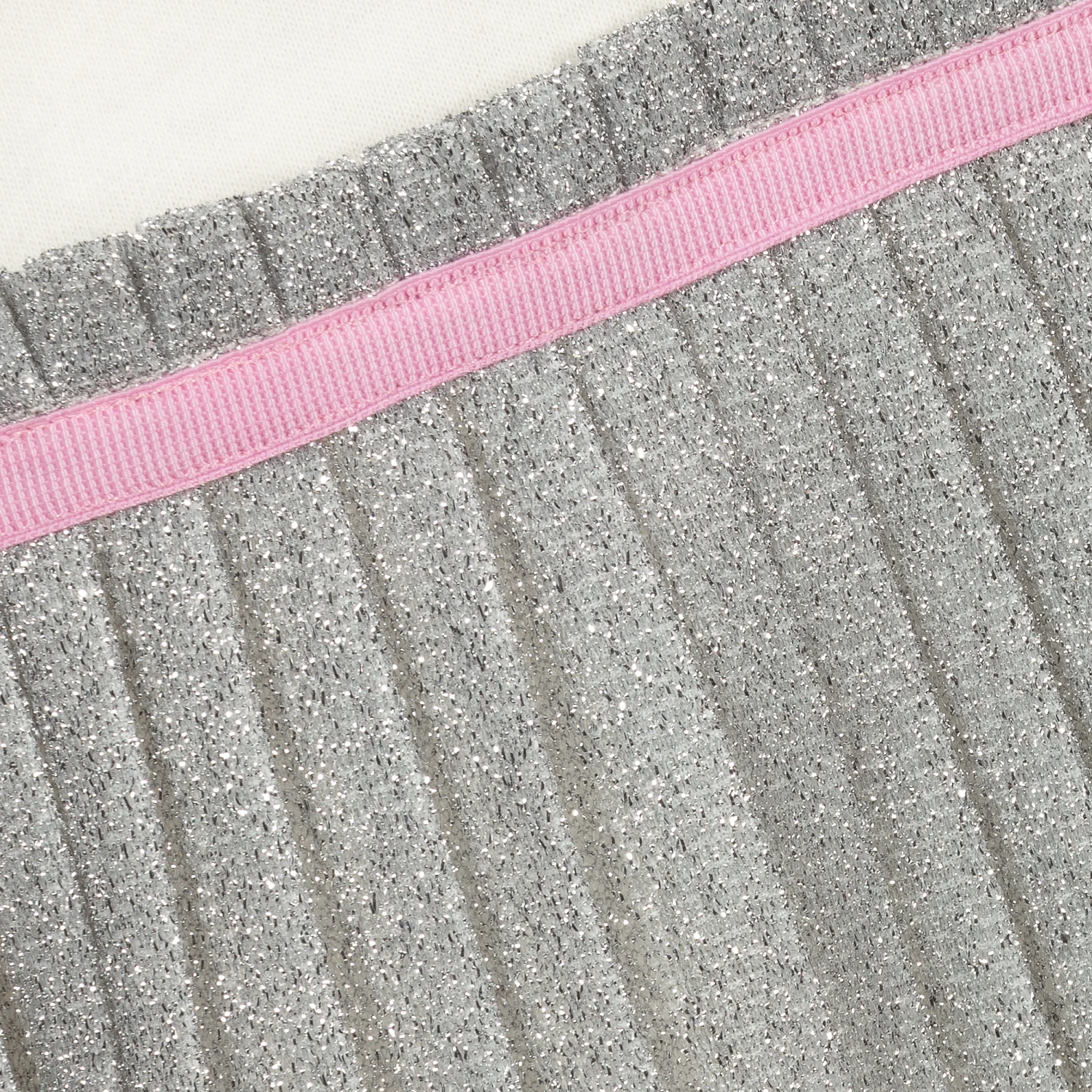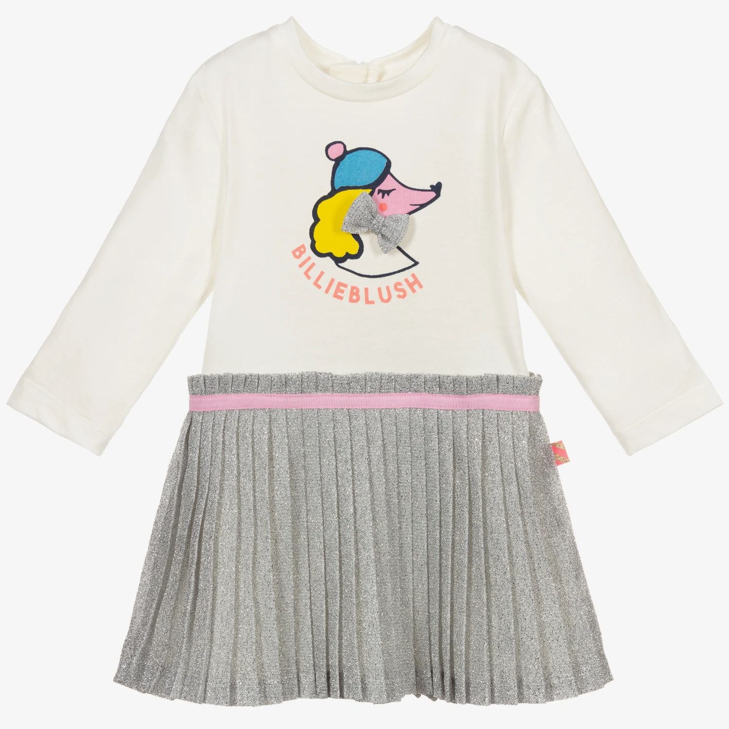 Ivory and silver dress for little girls by Billieblush. The bodice is made in soft cotton jersey, with a colourful dog print and neon pink logo. The glittery skirt is pleated and has pink trim around the waist. The dress has a concealed zip fastening on the back.