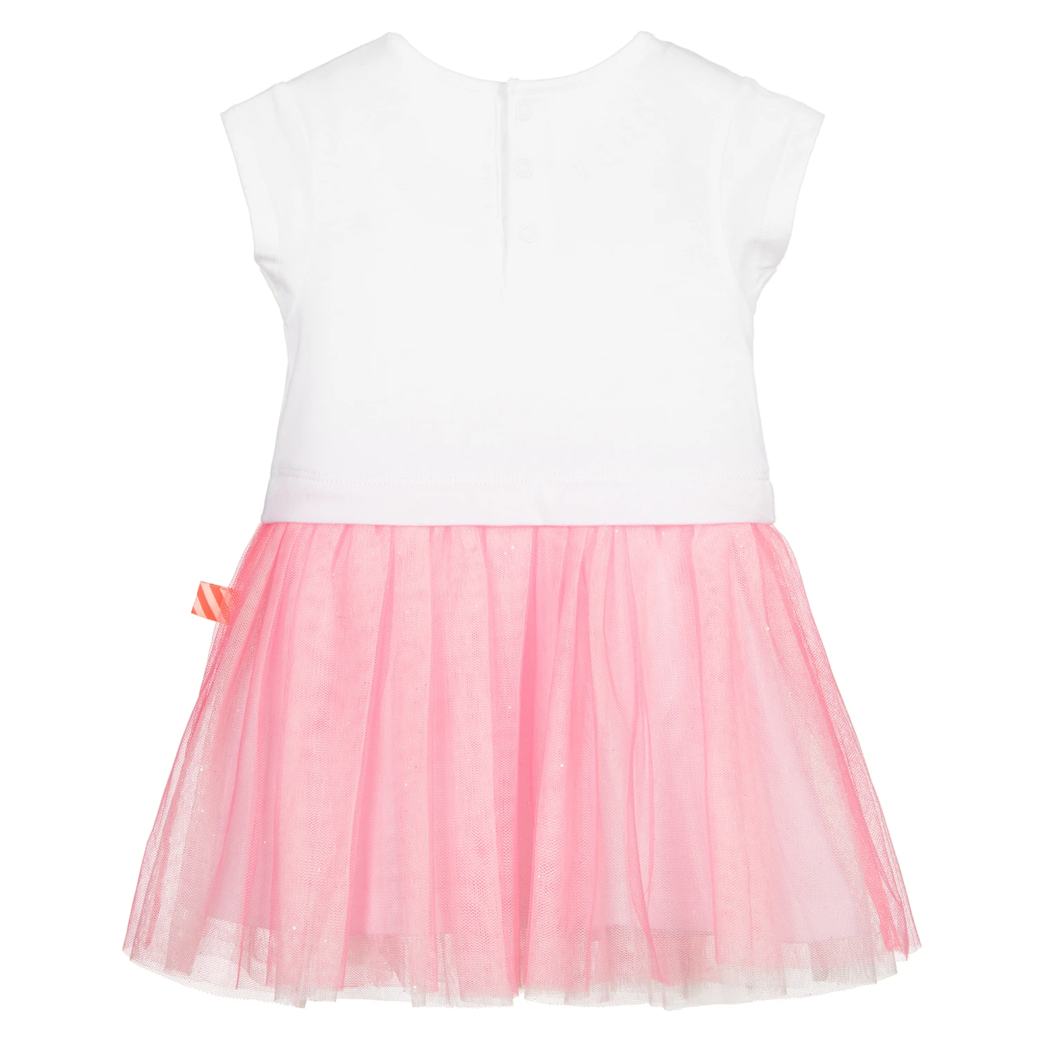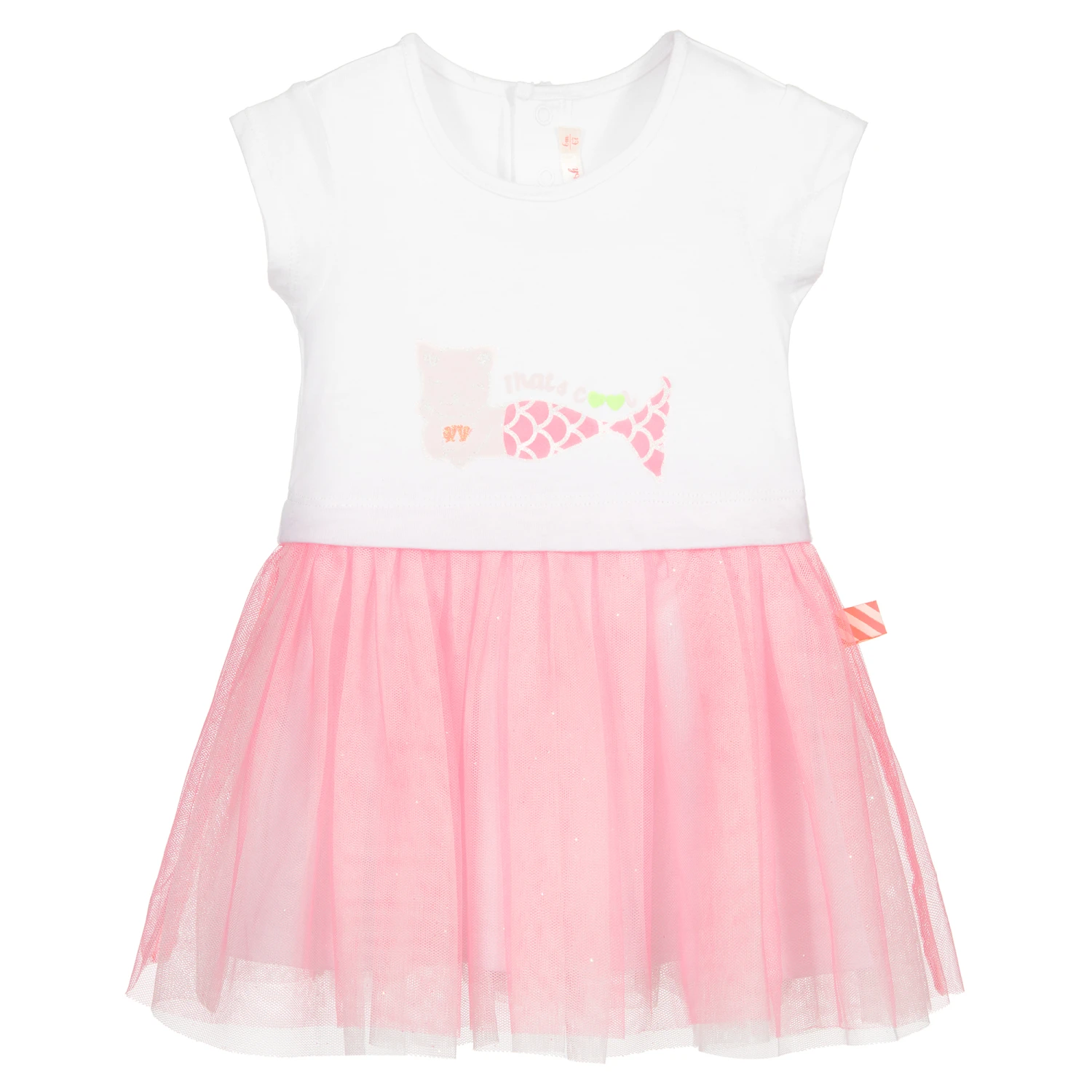 Cute dress for younger girls by Billieblush. Made in comfortable white cotton jersey, it has a glittery pink mermaid cat printed on the bodice, with ‘That’s Cool’ printed above. The skirt has pretty over-layers of glittery pink tulle. The dress has capped sleeves and useful popper fastenings on the back.