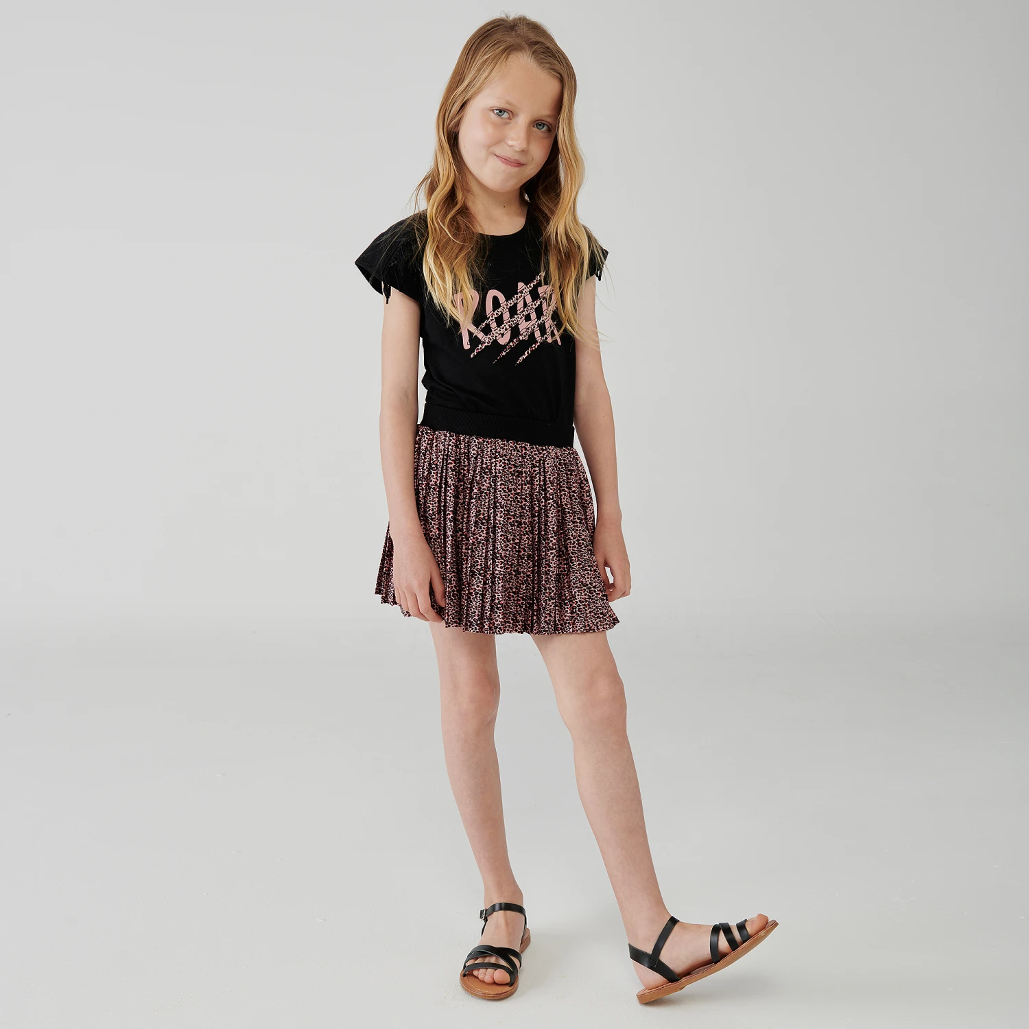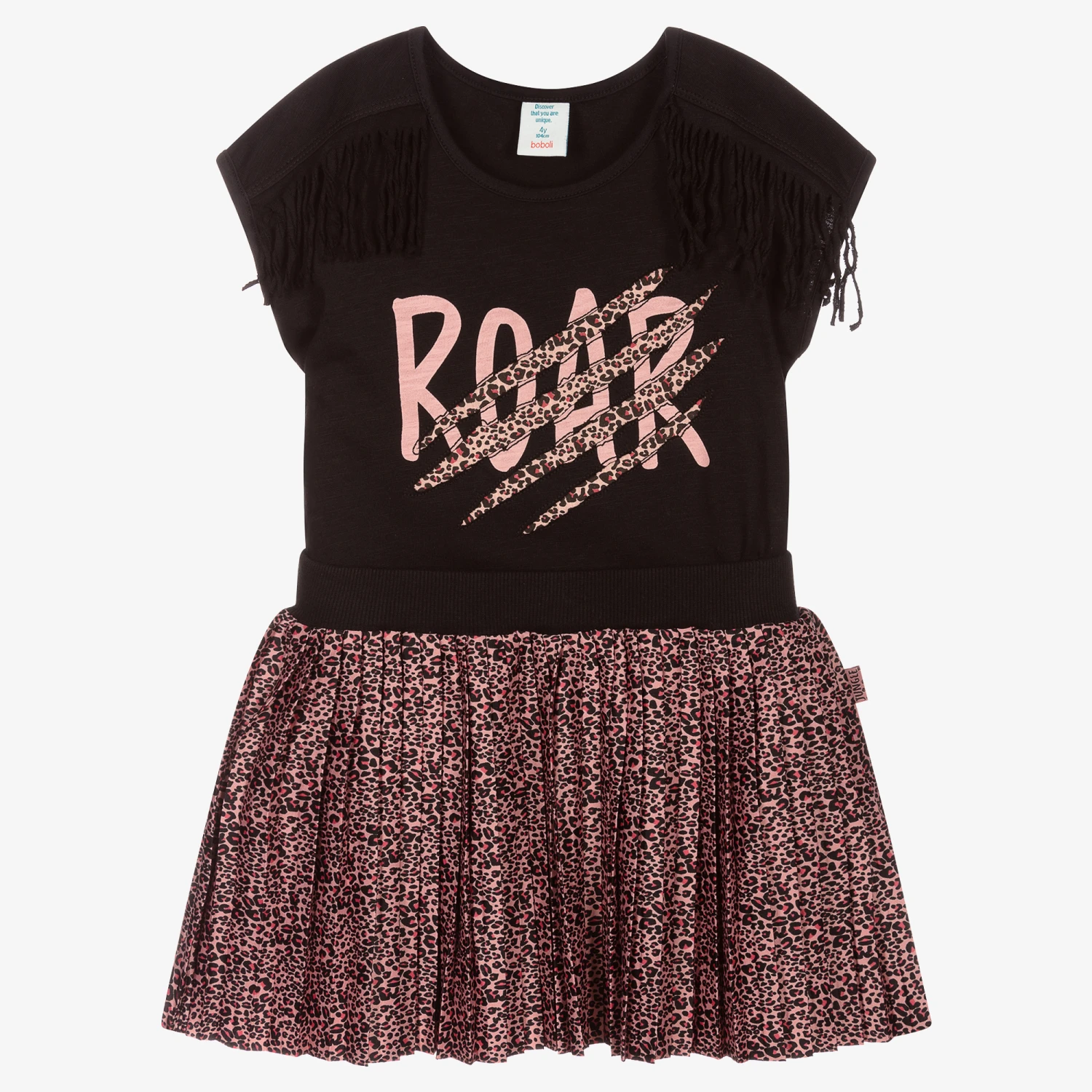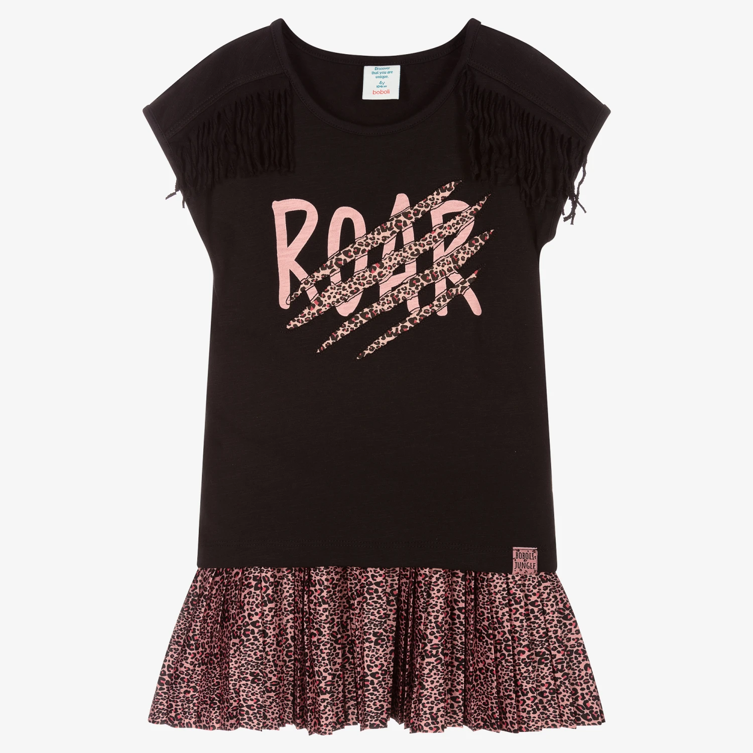 Black and pink animal print skirt set for girls by Boboli. Appearing with a scratched, clawed-effect design, the black cotton jersey T-shirt has pink leopard print stripes on the front, with a ‘Roar’ graphic and fun fringing on the shoulders. Made in soft, lightweight satin, the pleated leopard print skirt has a comfortable ribbed, stretchy waist.