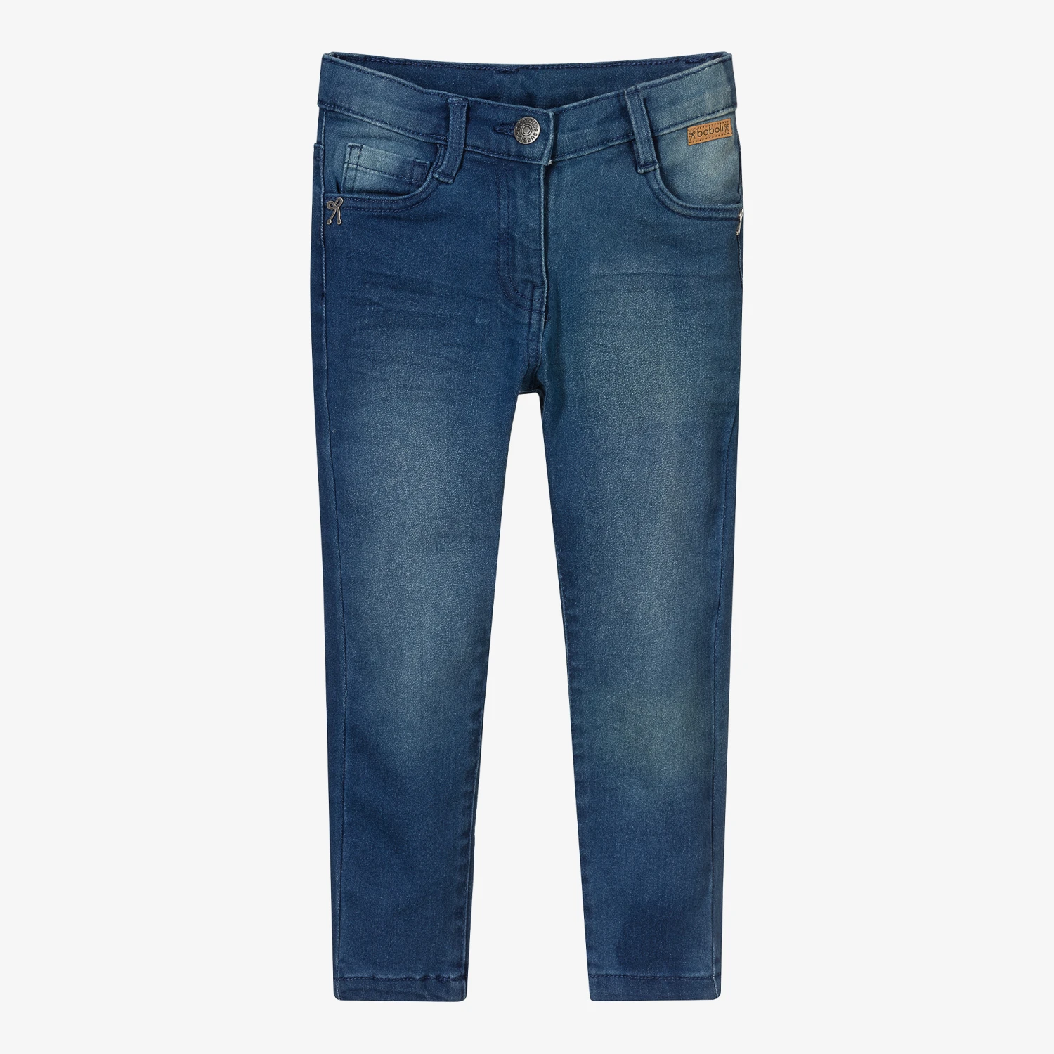 Girls blue skinny fit jeans by Boboli, made in stretchy mid-weight denim with a washed and worn look. They have pretty metal bow rivets by the front pockets with the brand’s logo tab on one side and a useful, adjustable waistband.