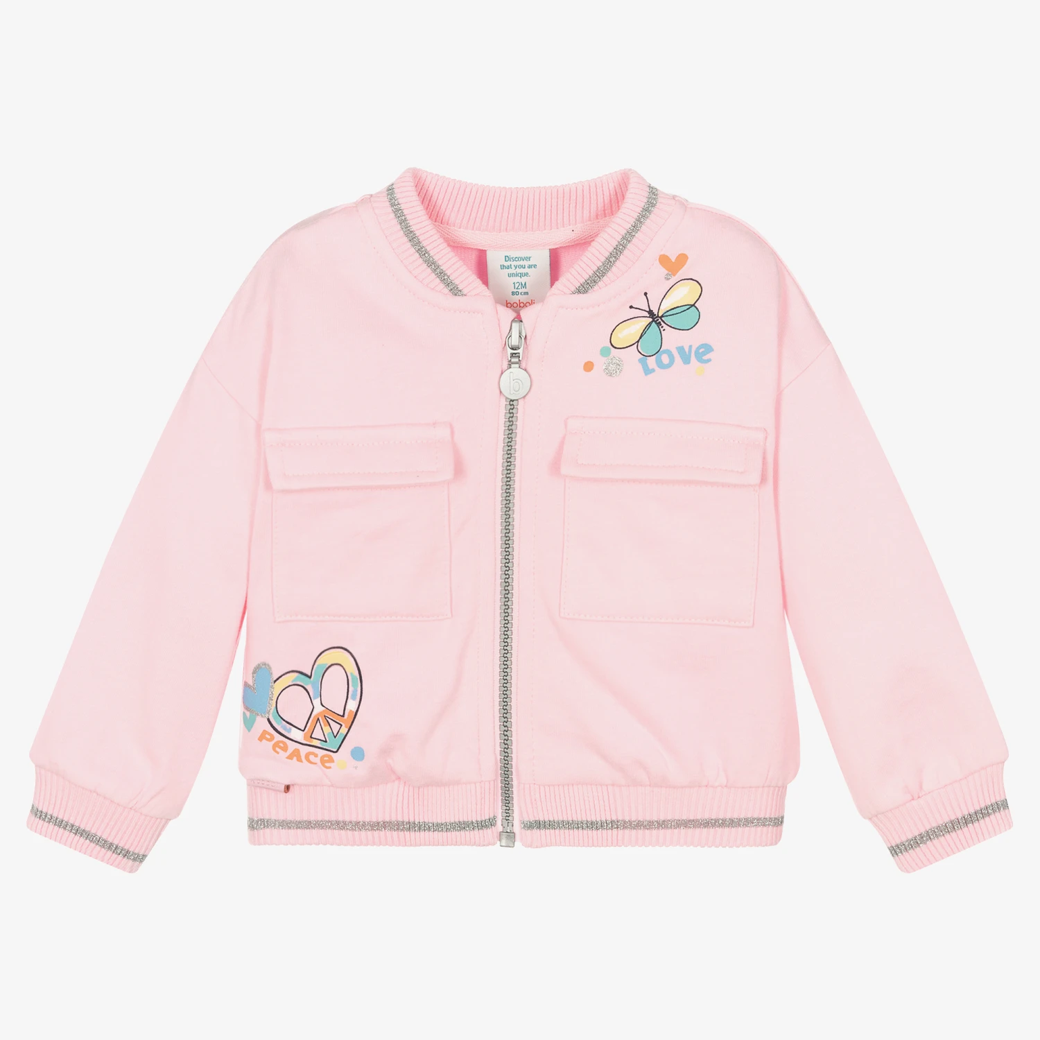 Casual pink zip-up top for younger girls by Boboli, made in soft cotton jersey. In a bomber style with sparkly trims, this fun top has positive and colourful slogan prints on the front and back, with butterflies, flowers and a peace symbol.