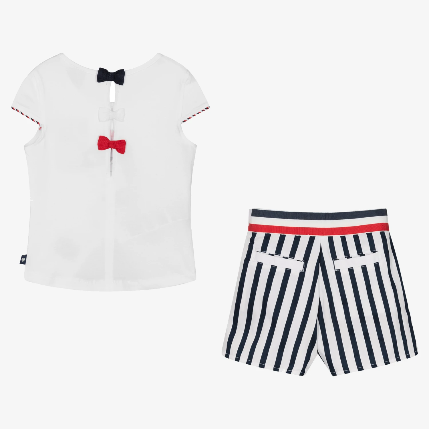 Girls white and navy blue striped shorts set from Boboli, made in soft cotton. The cute white cotton jersey T-shirt has a cute girl print on the front, with tulle and beads detailing. There are striped trims and red and white bows on the back. The cool poplin shorts have a navy blue striped design and a grosgrain waist with a bow on the front. Complete with adjustable waist, they fasten easily with a concealed side zip.