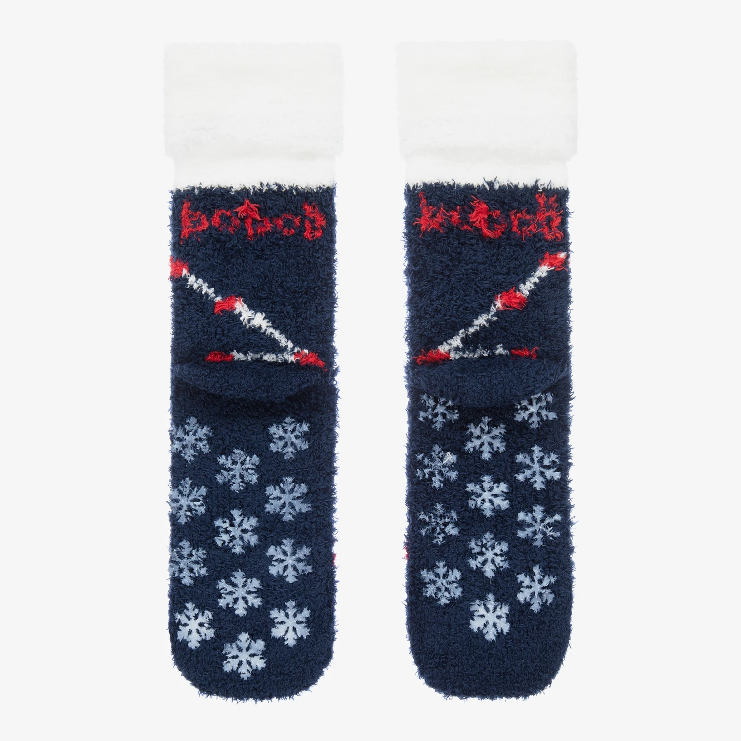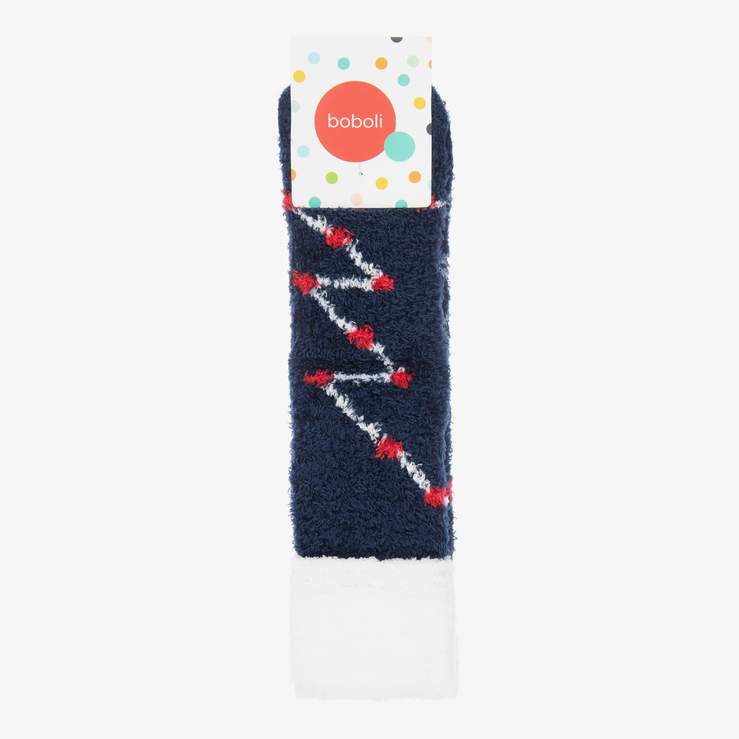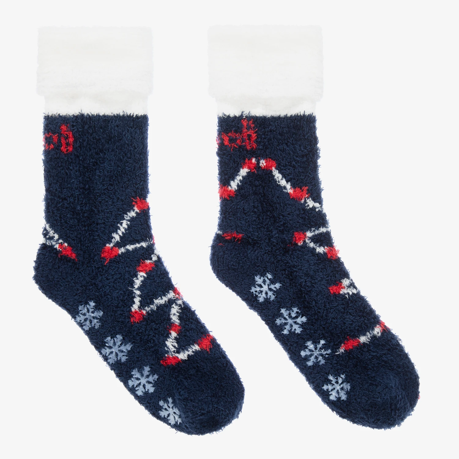 Girls and boys navy blue and white Christmas-themed socks from Boboli. They are soft and fluffy with a red logo on the heel and a Christmas tree design on the front. They have rubberised snowflakes on the soles so can be worn as slipper socks.