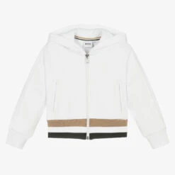 Cropped white zip-up hoodie for girls by BOSS, with a tonal logo print on the chest. Made in soft mid-weight cotton jersey, it has cool mesh trim on the back, along the sleeves and lining the hood and pockets. For a designer finish, there is a bold black logo print on the back and the wide waistband features the signature stripes in beige, white and black.