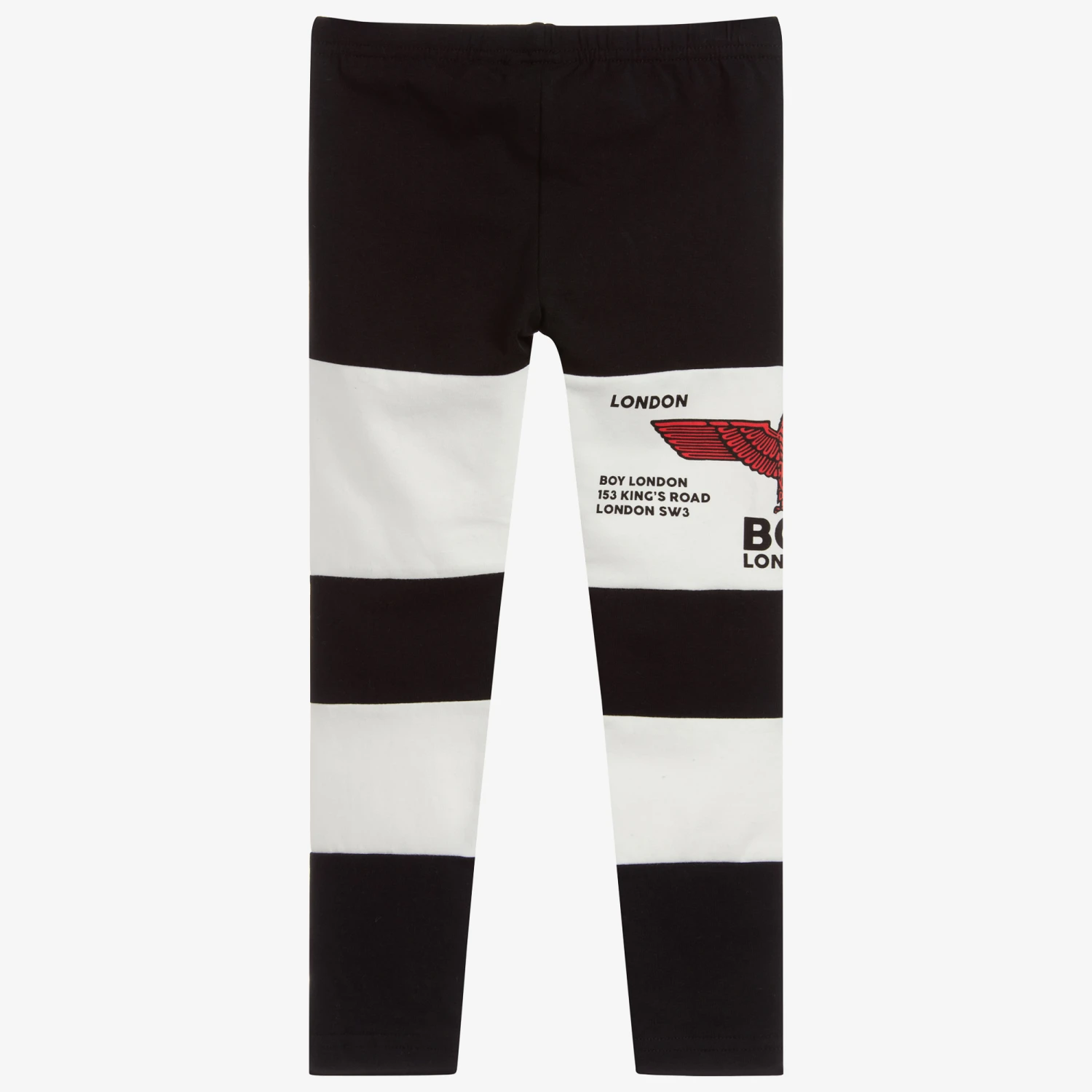 Girls black cotton jersey leggings by BOY London, with white panels on the legs. These soft and stretchy leggings have a lightly elasticated waistband and a red wings logo on one leg.