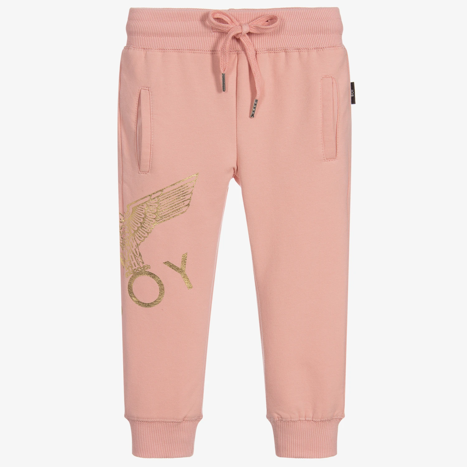 Boys and girls pink cotton joggers by BOY London, with the brand’s gold eagle logo print. They have an elasticated drawstring waist.