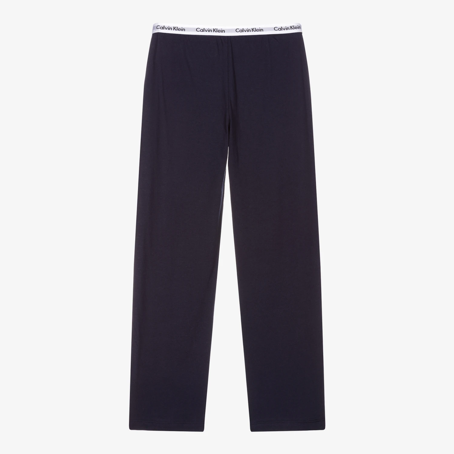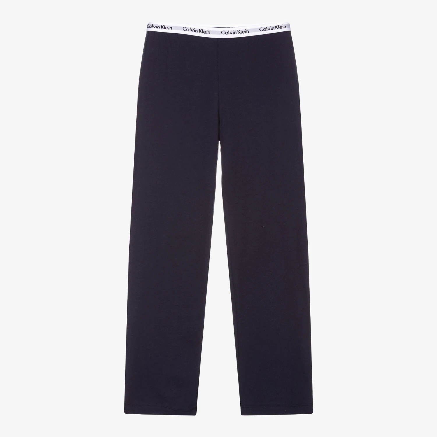 Made in soft and lightweight cotton jersey, a pair of navy blue trousers for girls by Calvin Klein. This comfortable loungewear style has a white elasticated waistband with a navy blue repeat logo.