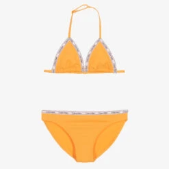 Girls mango orange bikini by Calvin Klein. Made from at least 75% recycled fibres, this sporty two-piece has a triangle top with logo-branded trims and adjustable straps. The matching briefs are included.