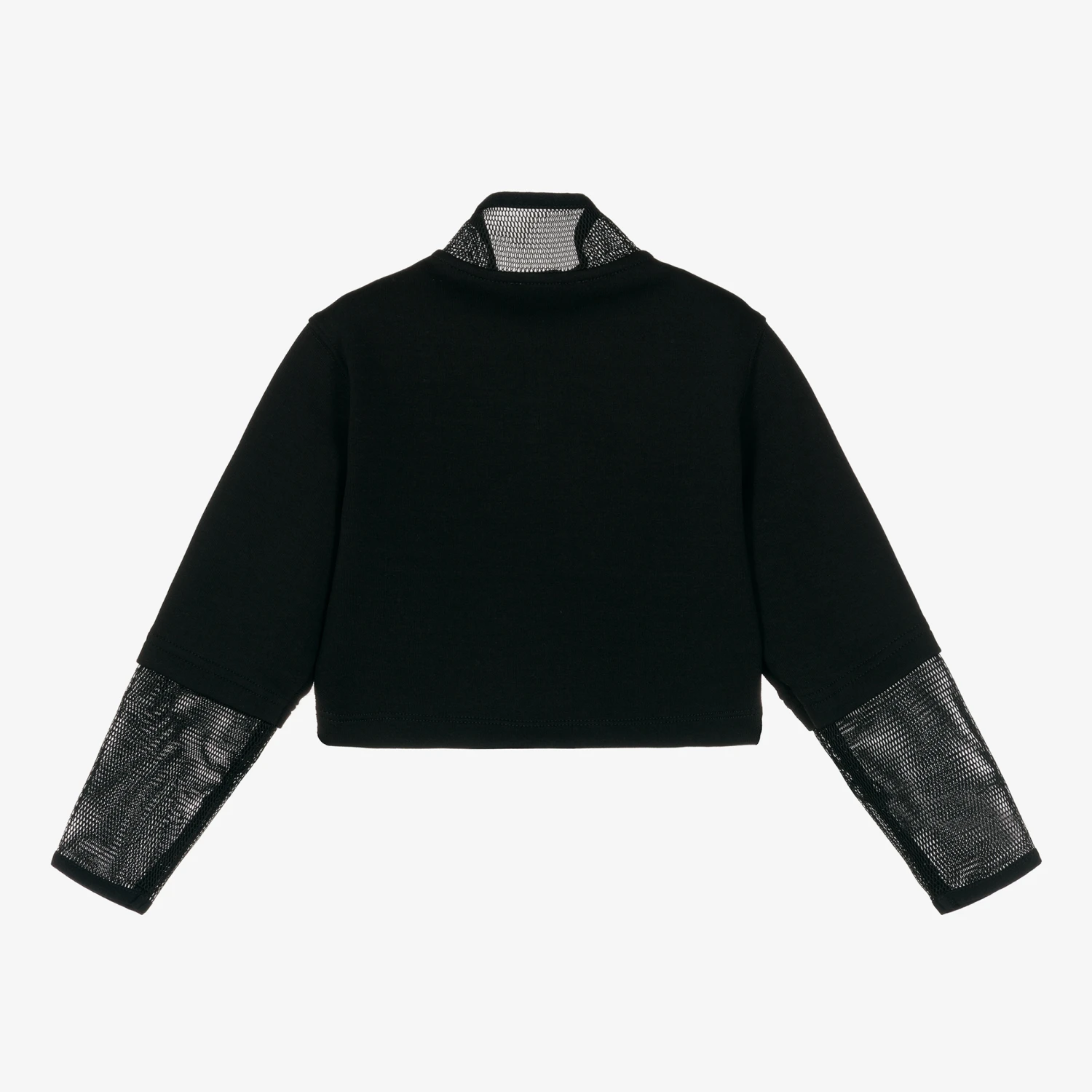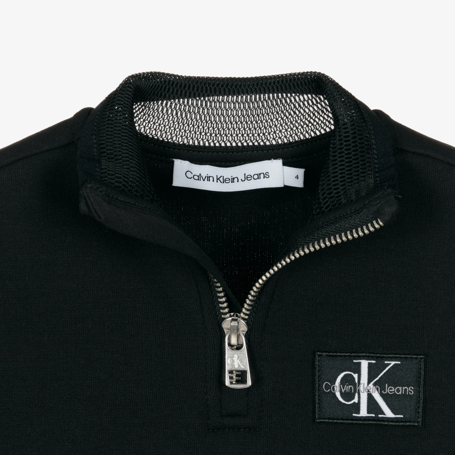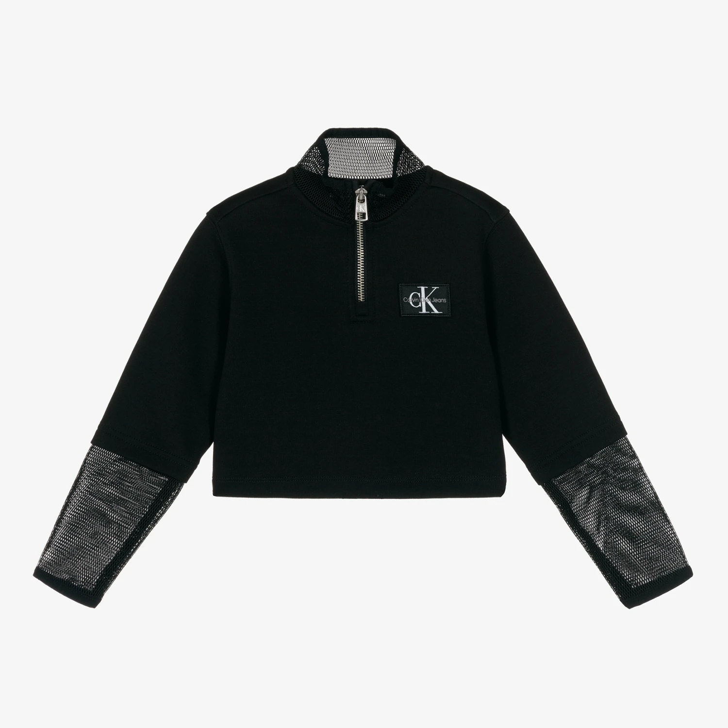 Black sweatshirt for girls by Calvin Klein Jeans, made in stretchy cotton-blend jersey. A sporty design, it has a mesh funnel collar with a half zip opening and matching mesh trim on the sleeve cuffs. For a branded finish, there is an embroidered logo patch on the chest.