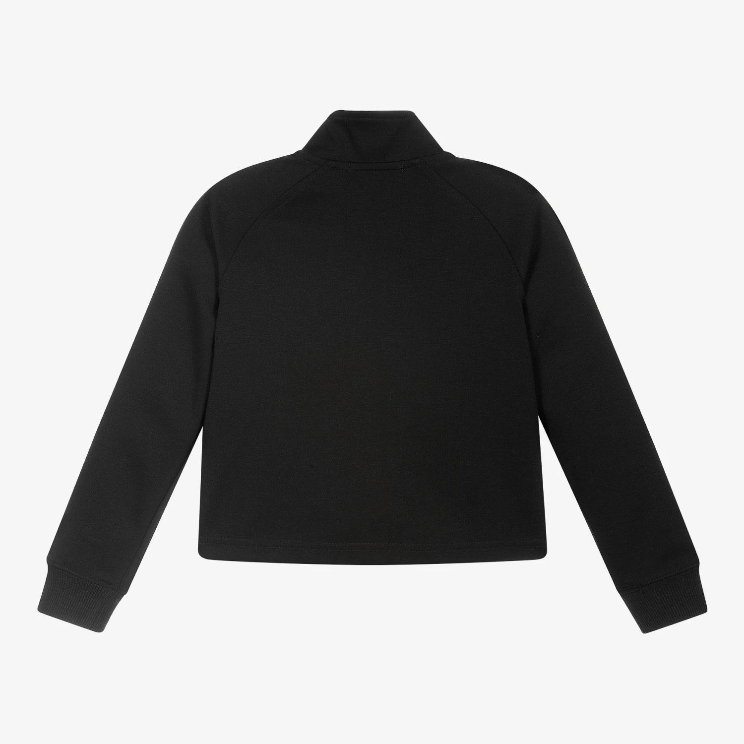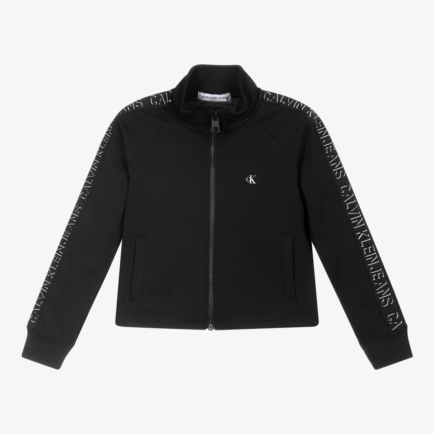 Black zip-up top by American designer Calvin Klein, made in sustainable Repreve® recycled polyester jersey. It has the brand’s black and white shadow logo tape along the raglan sleeves, with a further white monogram logo printed on the front. It fastens with an exposed zip, has a stand-up collar and ribbed cuffs.