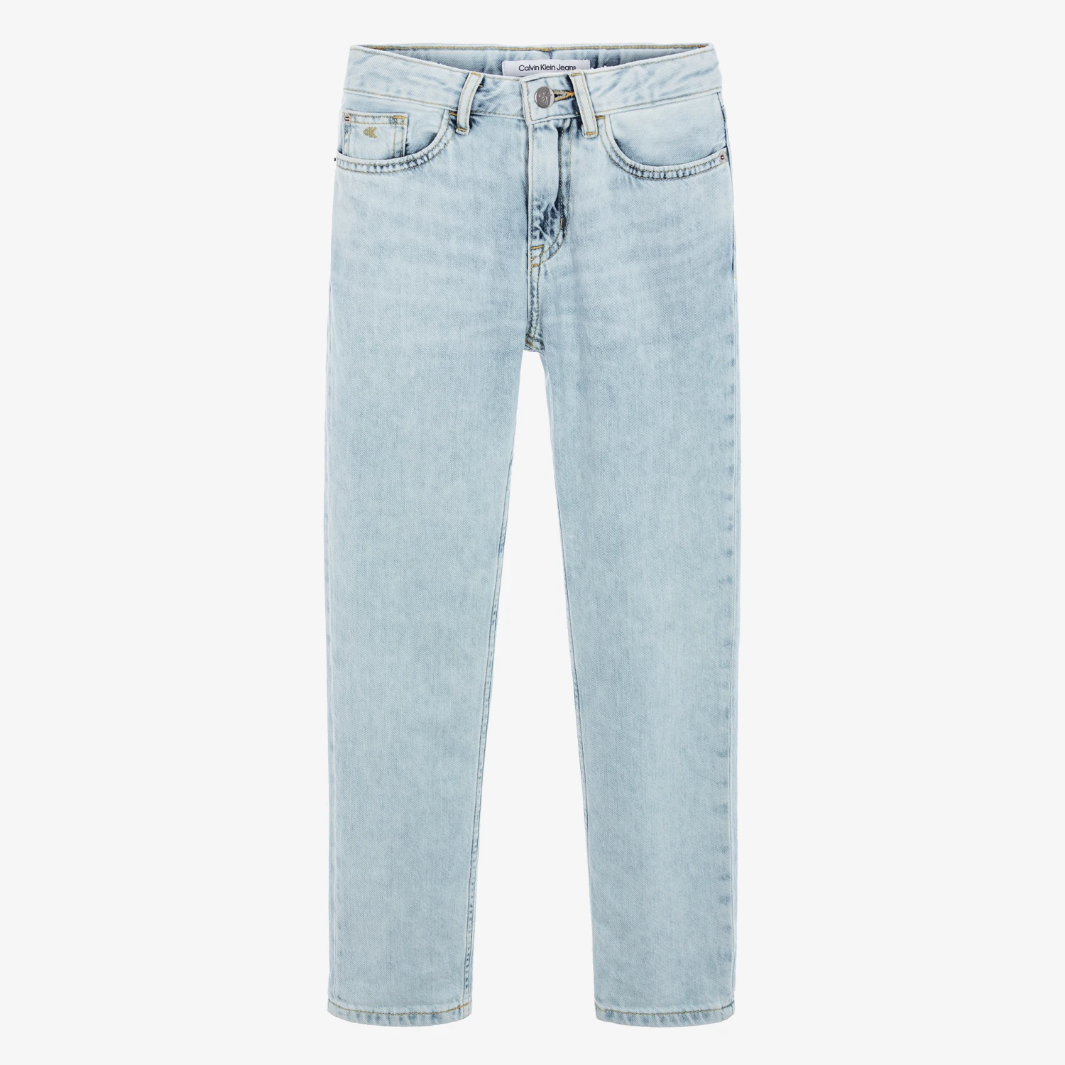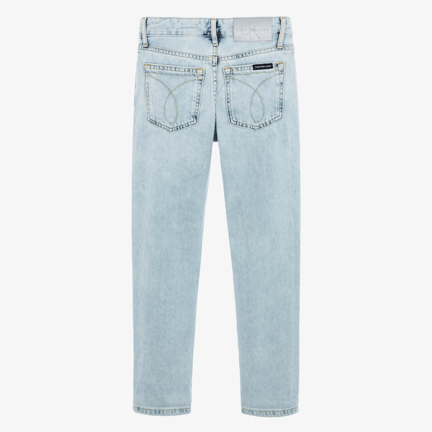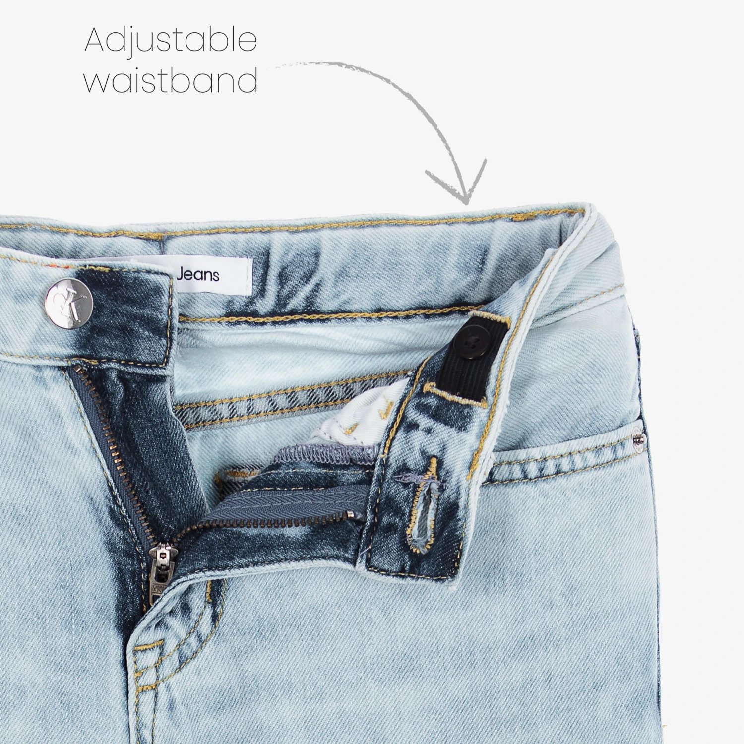 Light-wash blue jeans for girls by Calvin Klein Jeans, woven in soft denim. In a classic five pocket style, they fasten with a zip and branded button on the front, and have a comfortable adjustable waistband. There is an embroidered monogram logo on the coin pocket, with a silver monogram logo patch on the back waist.