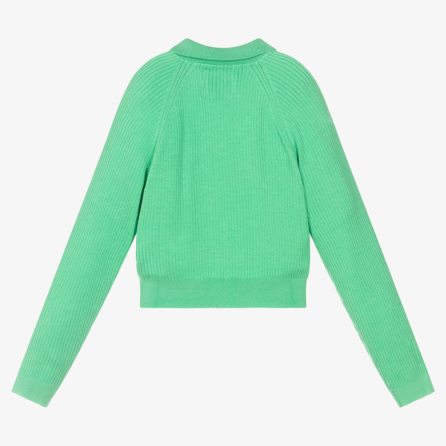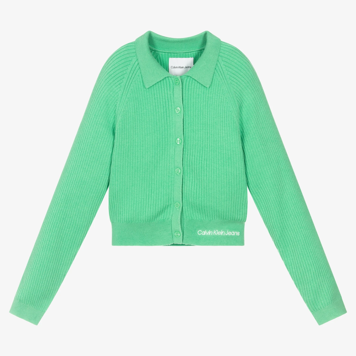 A lovely green cardigan for girls by Calvin Klein Jeans, knitted in soft, sustainable lyocell blend. This cardigan features a smart pointed collar, with an embroidered logo on the hem for preppy styling. Great as a layering piece, it has useful button fastenings on the front.