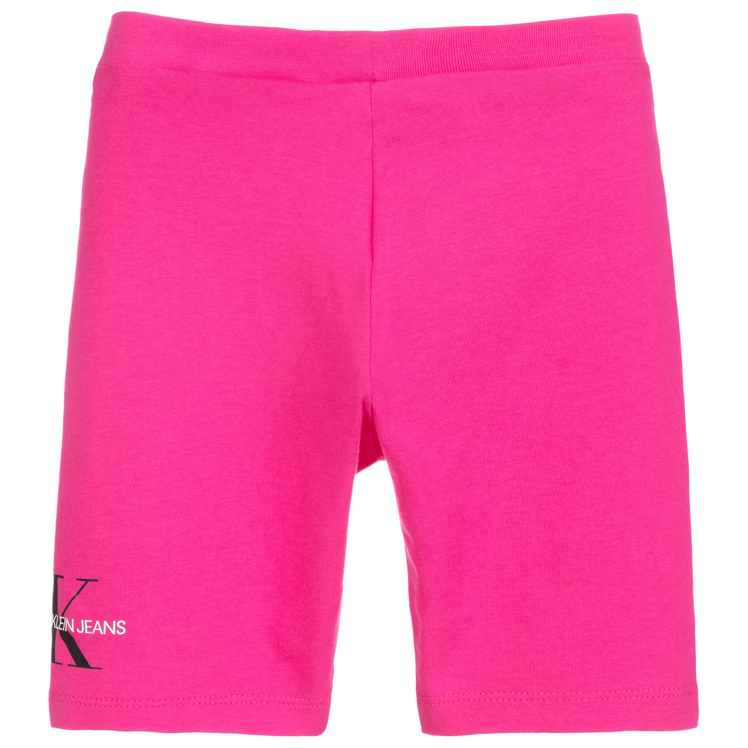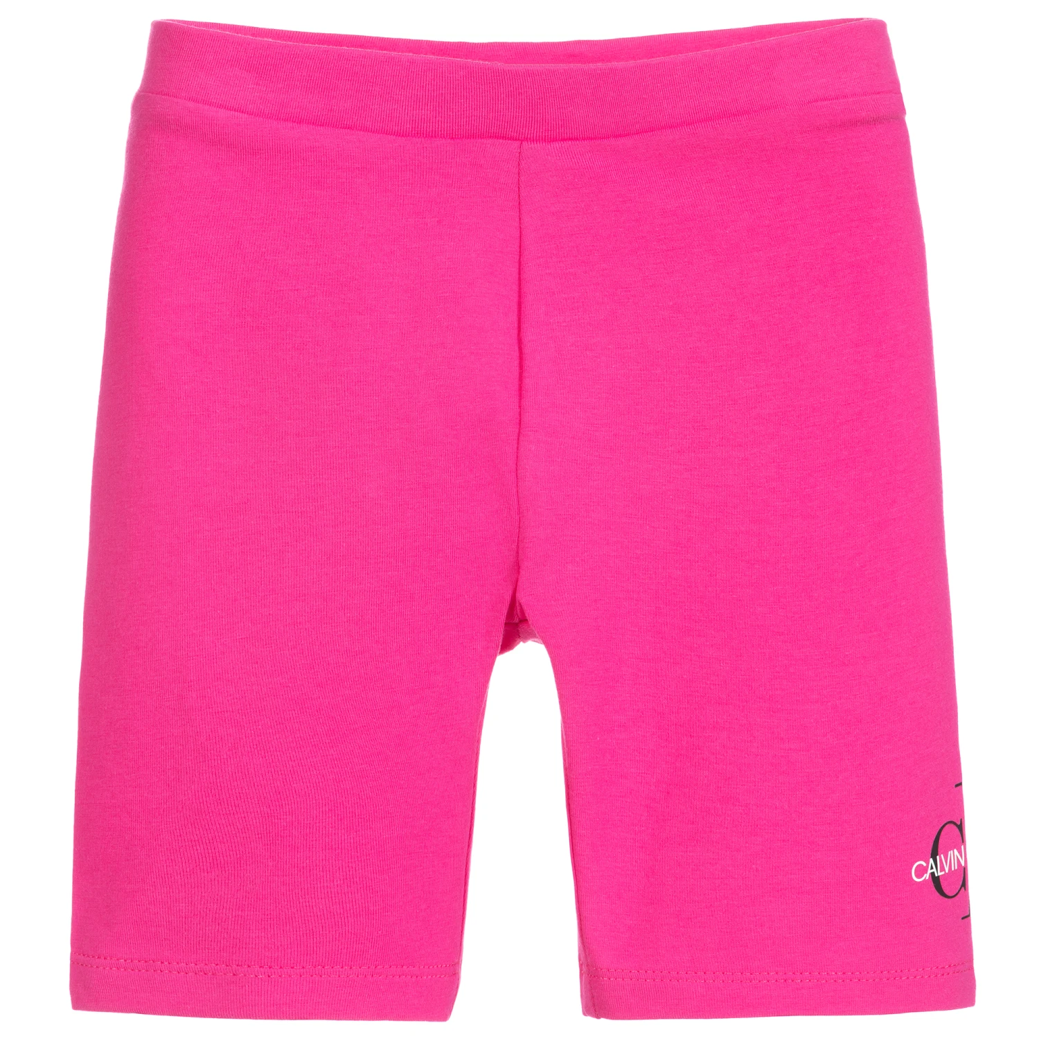 Bright pink organic cotton cycling shorts for girls by Calvin Klein Jeans. Soft and stretchy with an elasticated waist, they have a black and white printed logo on one of the legs