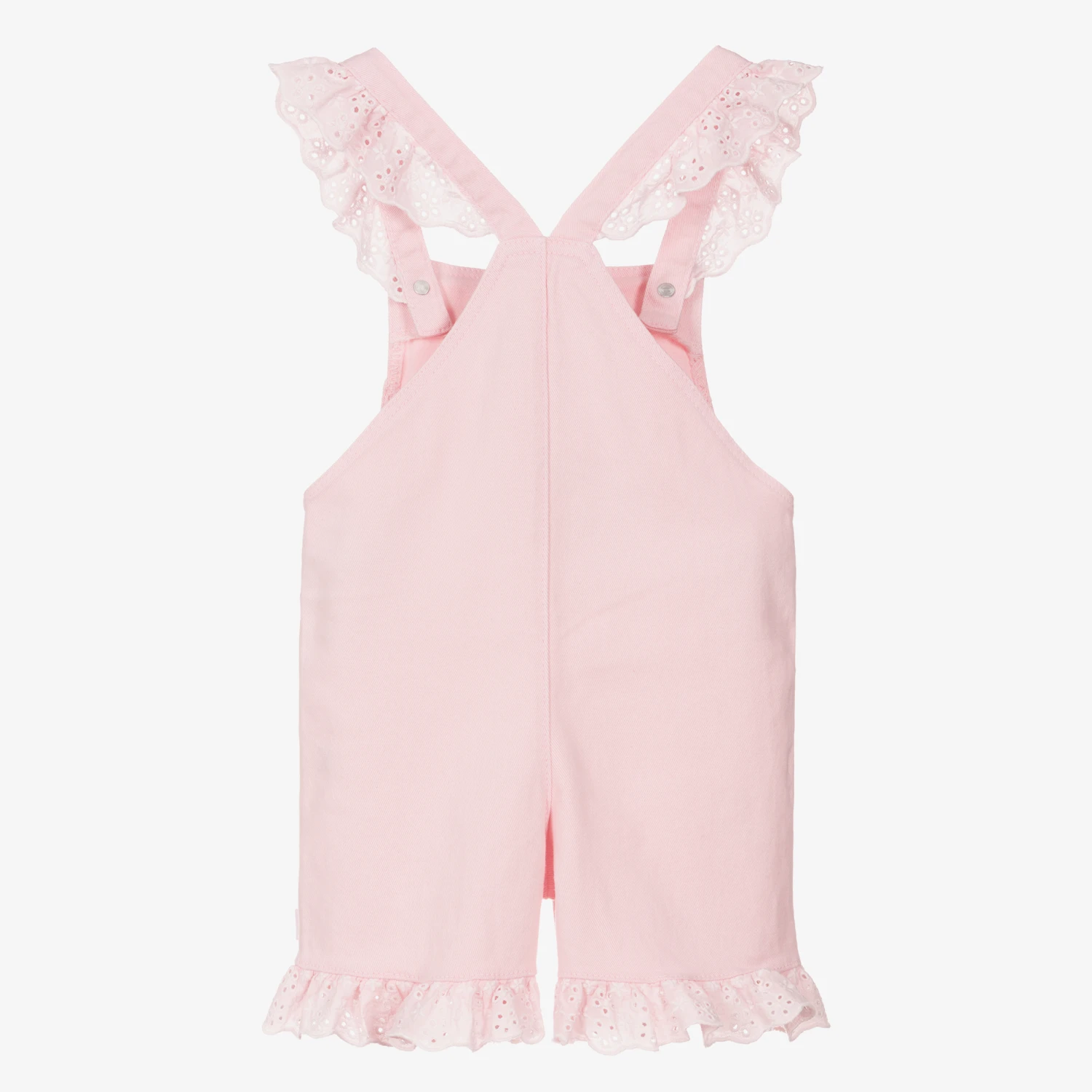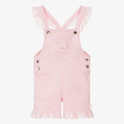 Cute pink dungarees for little girls by British designer Caramelo Kids, made in soft and stretchy cotton twill. Classically styled, they have broderie anglaise trims, sparkly diamantés and a pocket on the front. The shoulder straps and sides have silver button fastenings to ensure easy dressing.