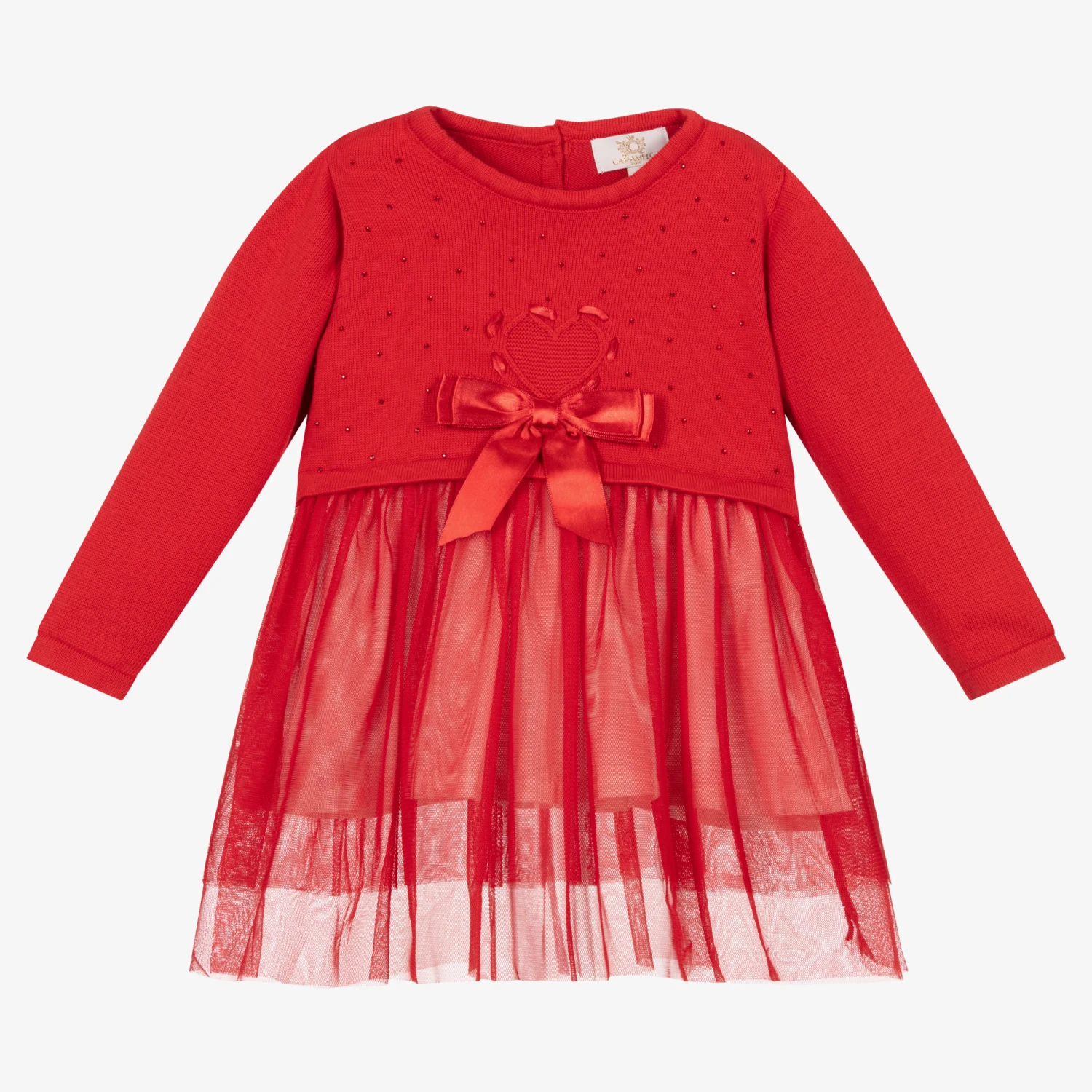 Cute, cosy and comfortable for a special occasion, this red dress for girls is from Caramelo Kids. It has a soft knitted cotton bodice with sparkly diamantés and a heart design on the front trimmed with satin ribbon. The gathered tulle skirt has a white cotton lining and the dress fastens with buttons on the back.