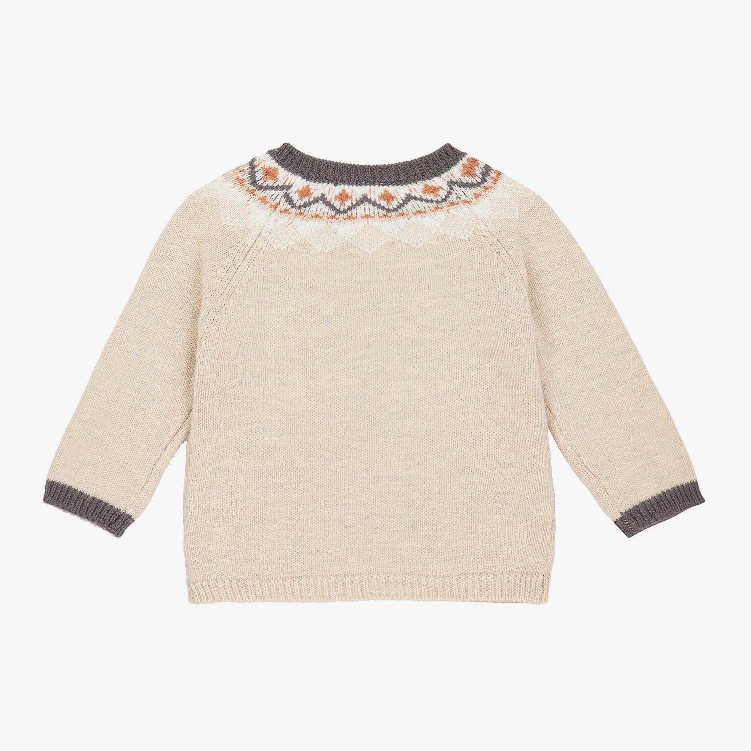 Little girls and boys beige cardigan from Carrément Beau, knitted in a lightweight organic cotton and viscose blend. It has a grey, brown and white Fair Isle pattern on the neckline and front button fastening. The designer’s ivory logo tab is sewn onto the front and it has grey ribbed trims.