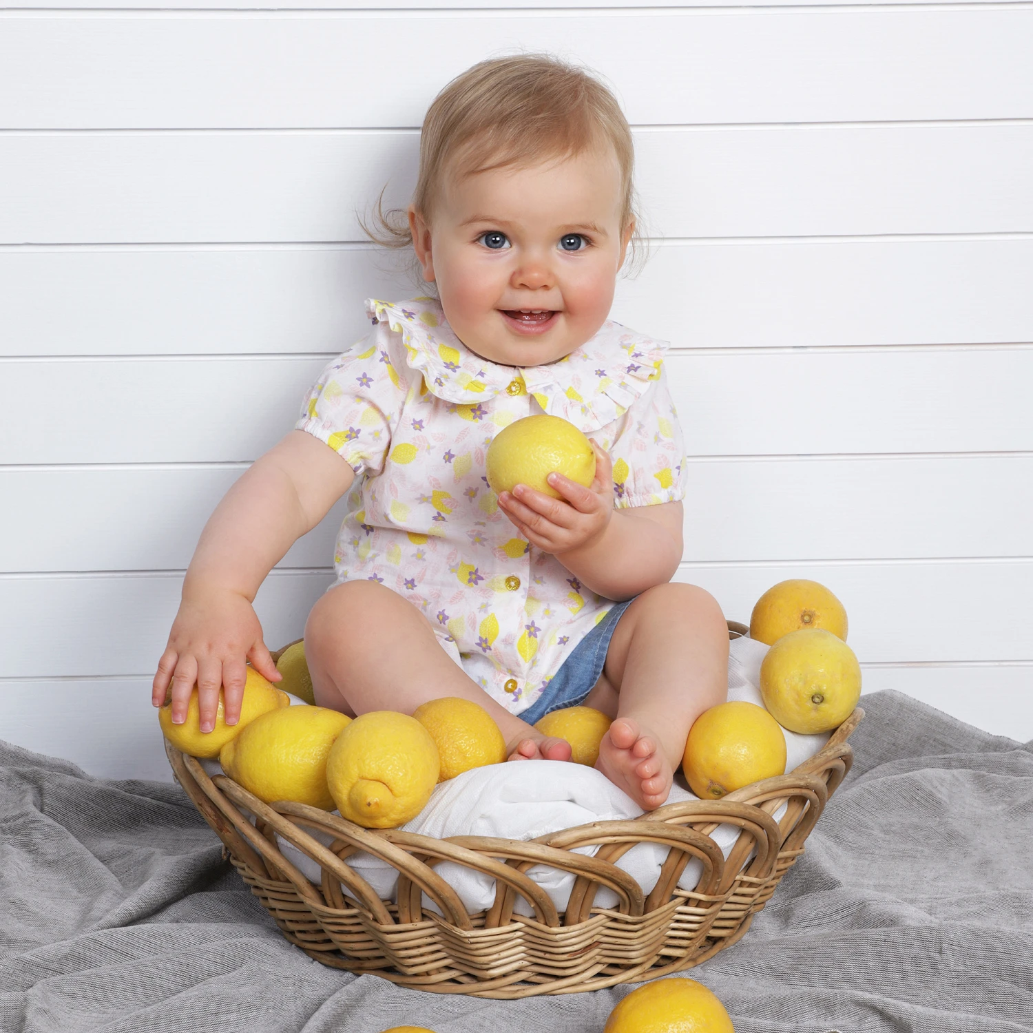 Pretty white blouse for little girls by classic French brand Carrément Beau, with a lemon and flower print in yellow, purple and pink. It has a frilled collar and gently elasticated sleeves. Made in lightweight poplin, it fastens on the front with glittery yellow buttons and has a rose gold logo tab by the hemline.