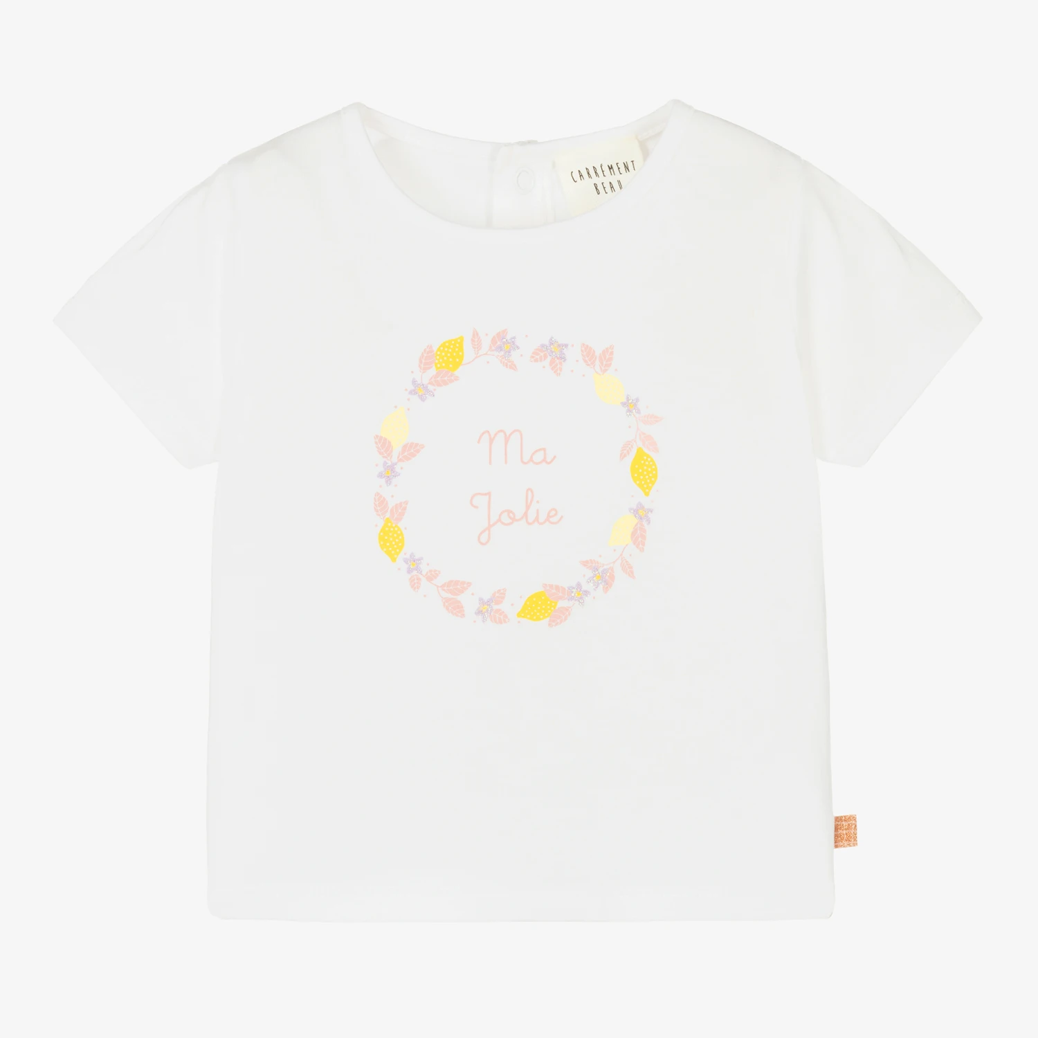 A pretty white T-shirt for little girls by French brand Carrément Beau. It has a sparkly flower and lemon garland print on the front in yellow, purple and pink, with the words ‘Ma Jolie’ in the centre. Made in soft and comfortable organic cotton jersey, it fastens easily with poppers on the back.