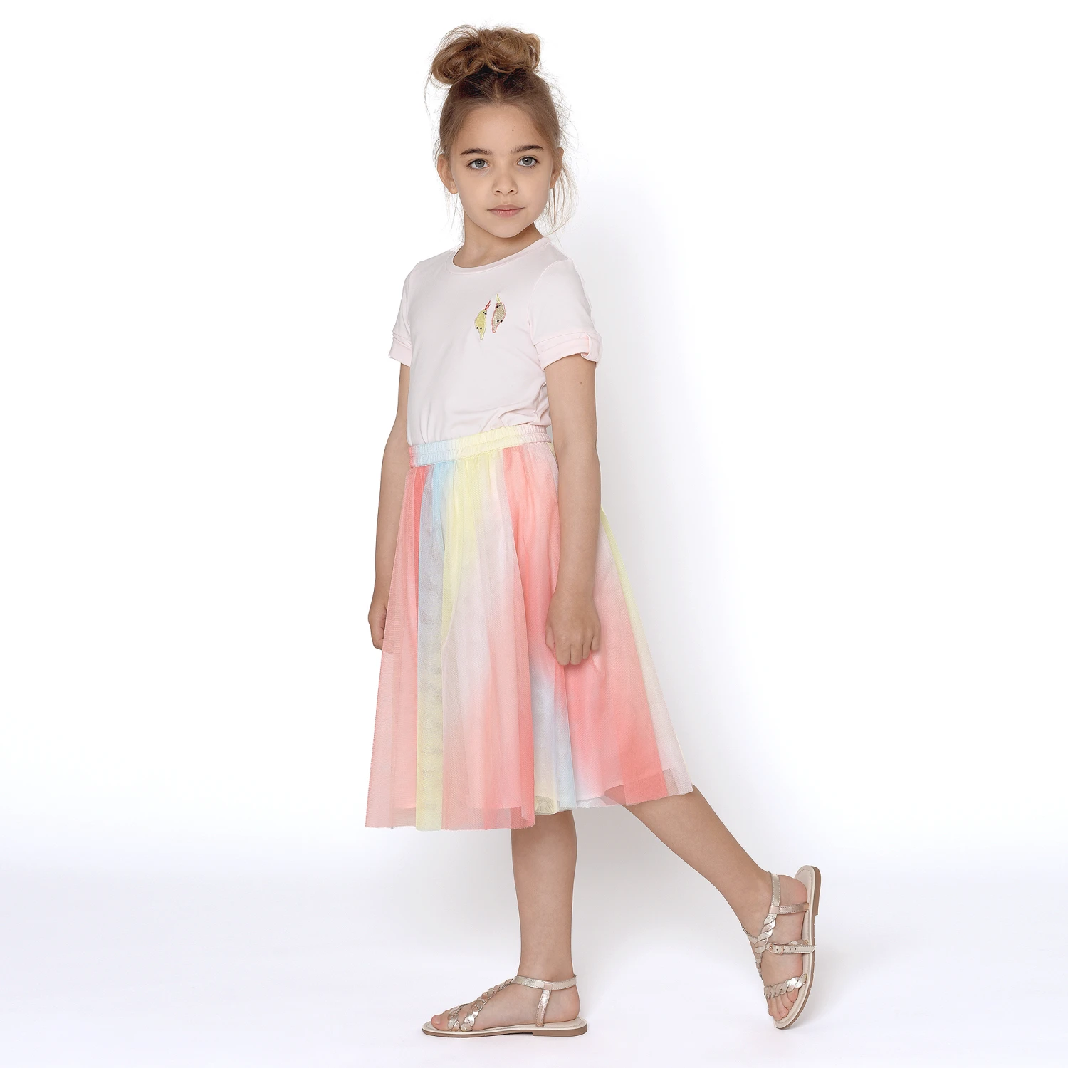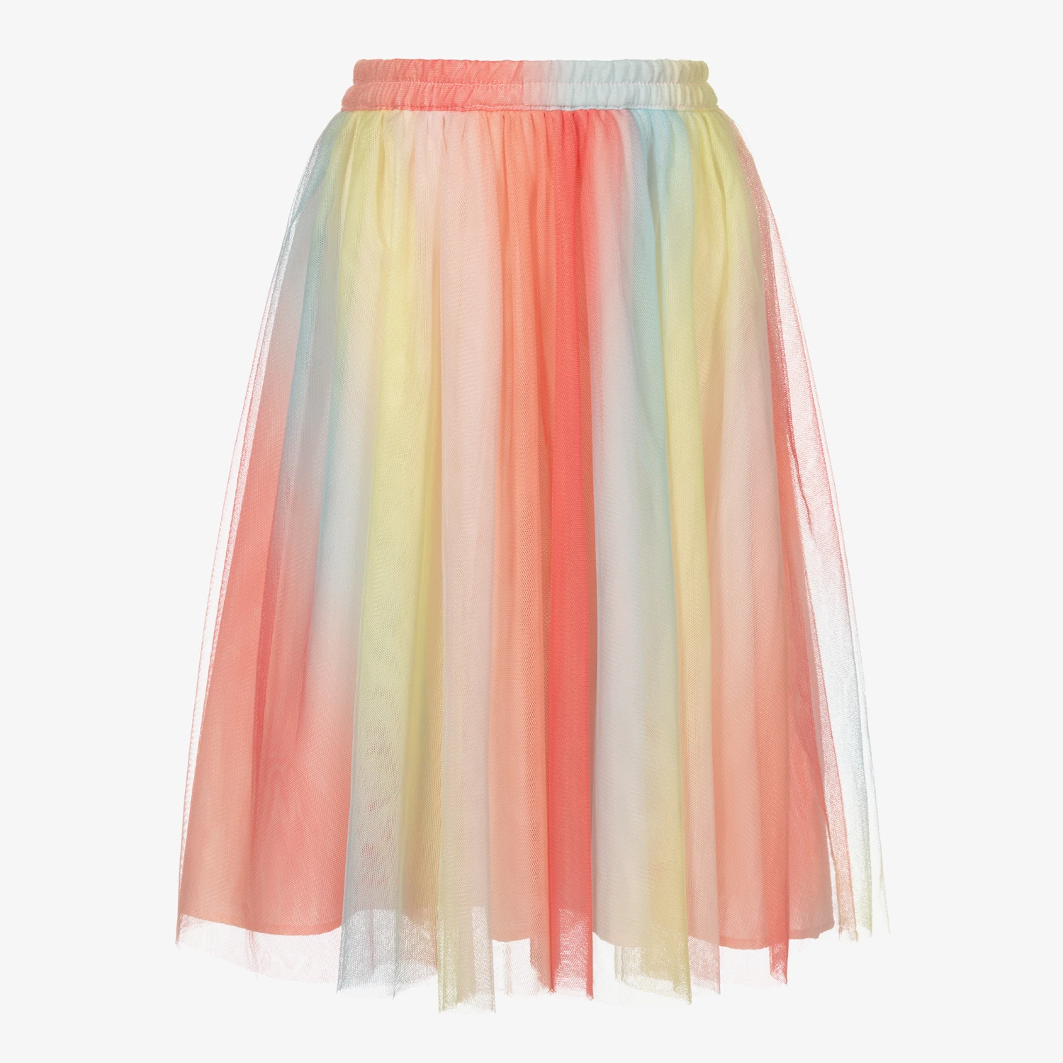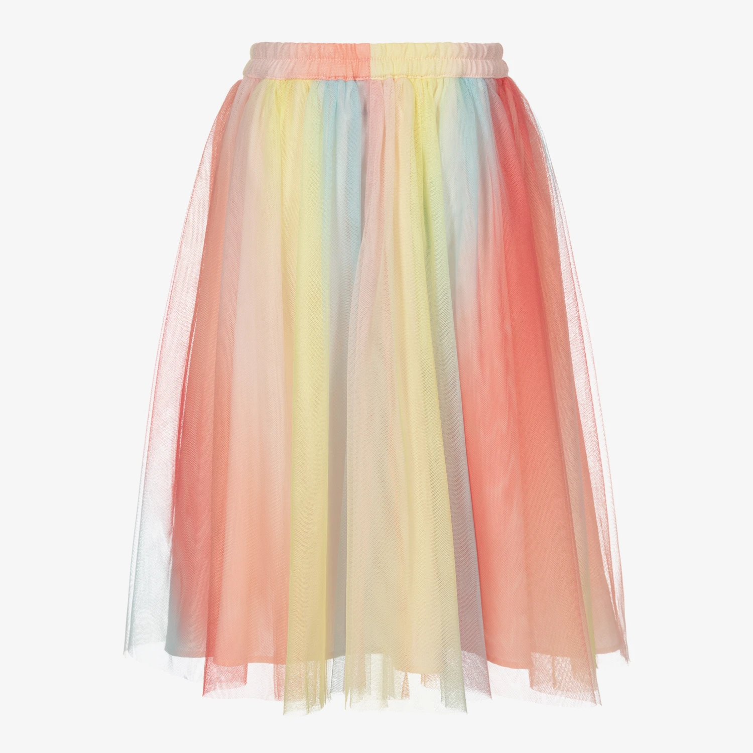A multicolour midi skirt for girls by Charabia, in shades of pink, blue and yellow. Made in layers of soft tulle, it has an elasticated waistband and a lightweight polycotton lining.