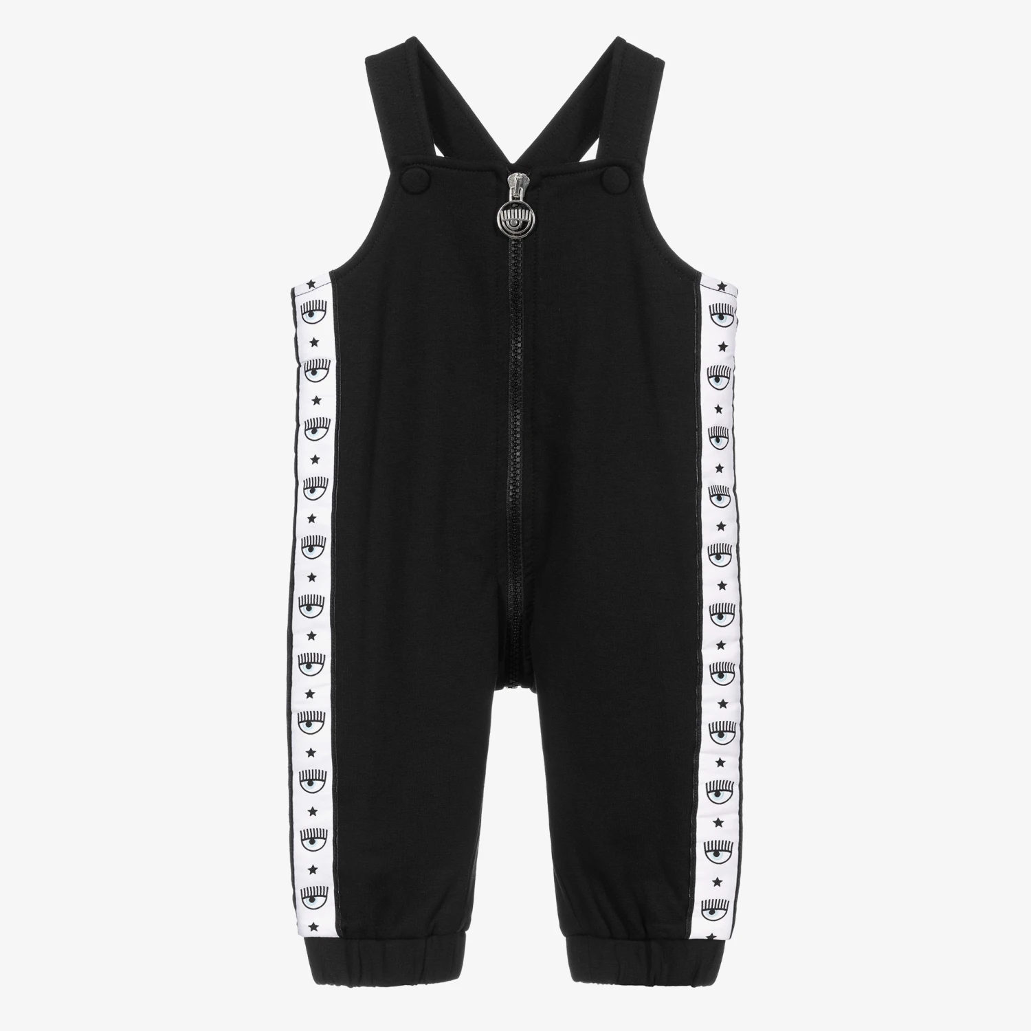 Little girls black cotton jersey dungarees by Chiara Ferragni Kids, with a handy logo zip fastening on the front and adjustable popper fastened shoulder straps. They have striking white taping on the sides, with the brands signature Eyelike logo.