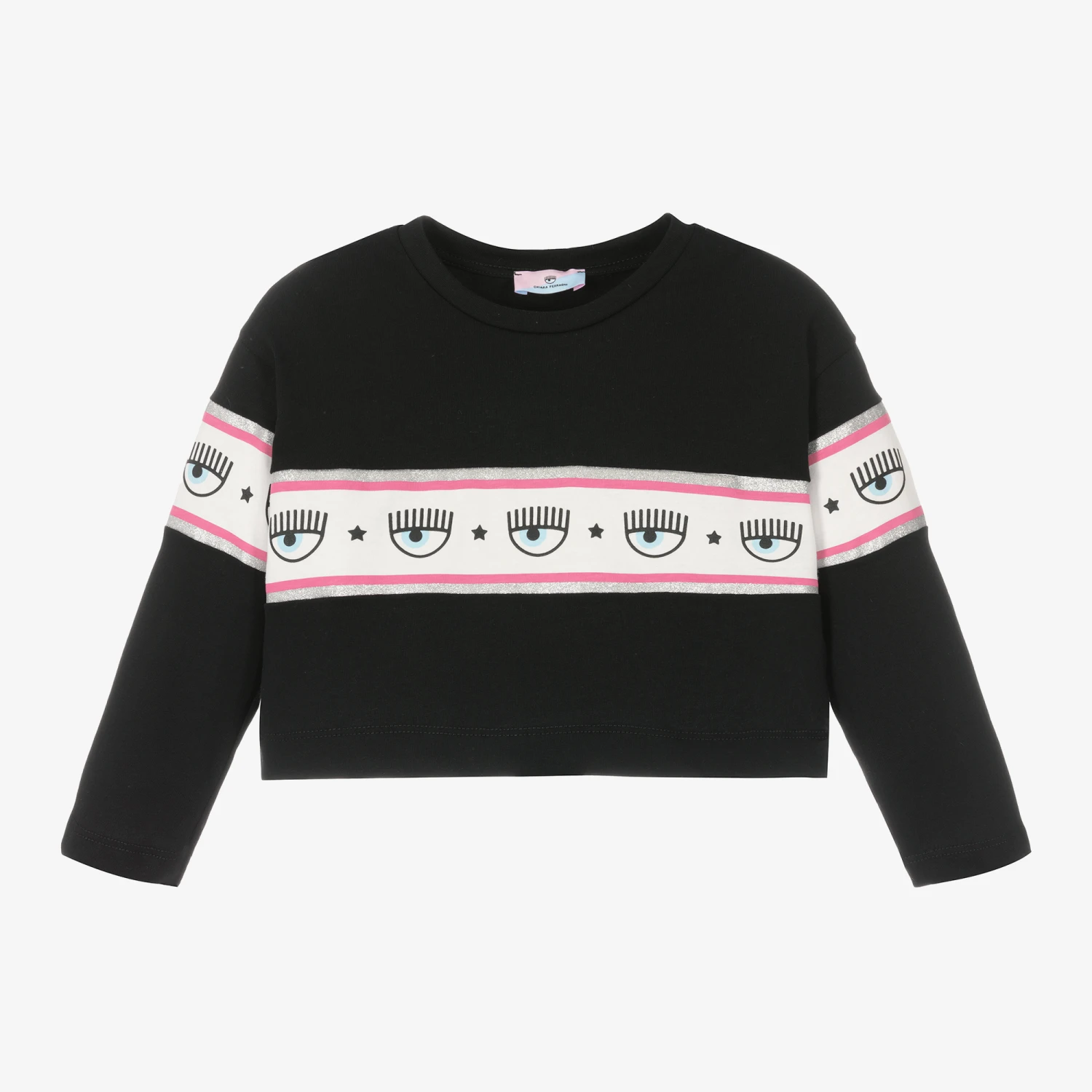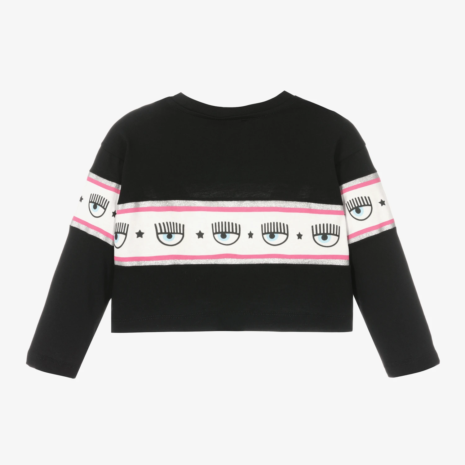 Boxy black cotton top for girls by Chiara Ferragni Kids, with a bold Logomania panel print across the middle.