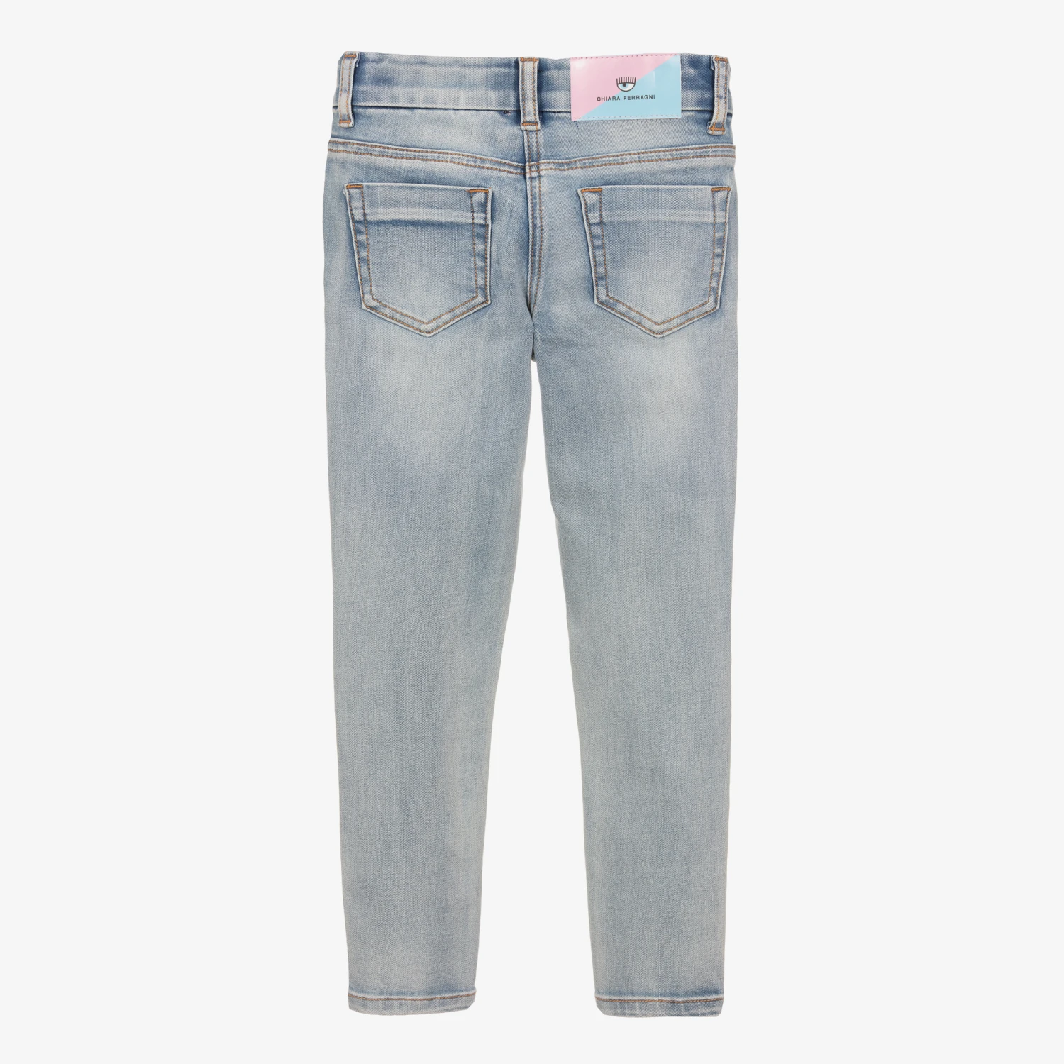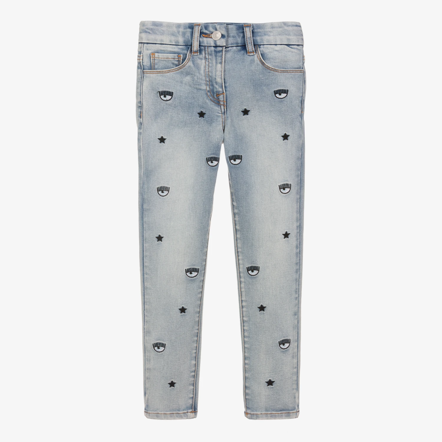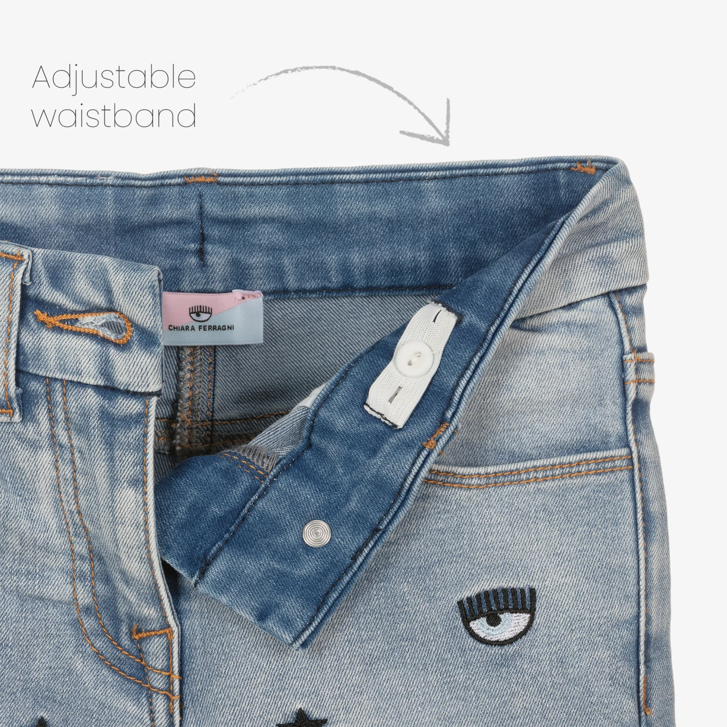 Blue jeans for girls by Italian designer Chiara Ferragni Kids, embroidered with the brand’s signature Logomania design on the front for a cool, edgy look. Made in a soft, stretchy cotton denim, they have a front zip and button fastening, with classic five-pocket styling and a pink and blue Eyelike logo jacron on the back. They have an adjustable waist for an ideal fit as your child grows.