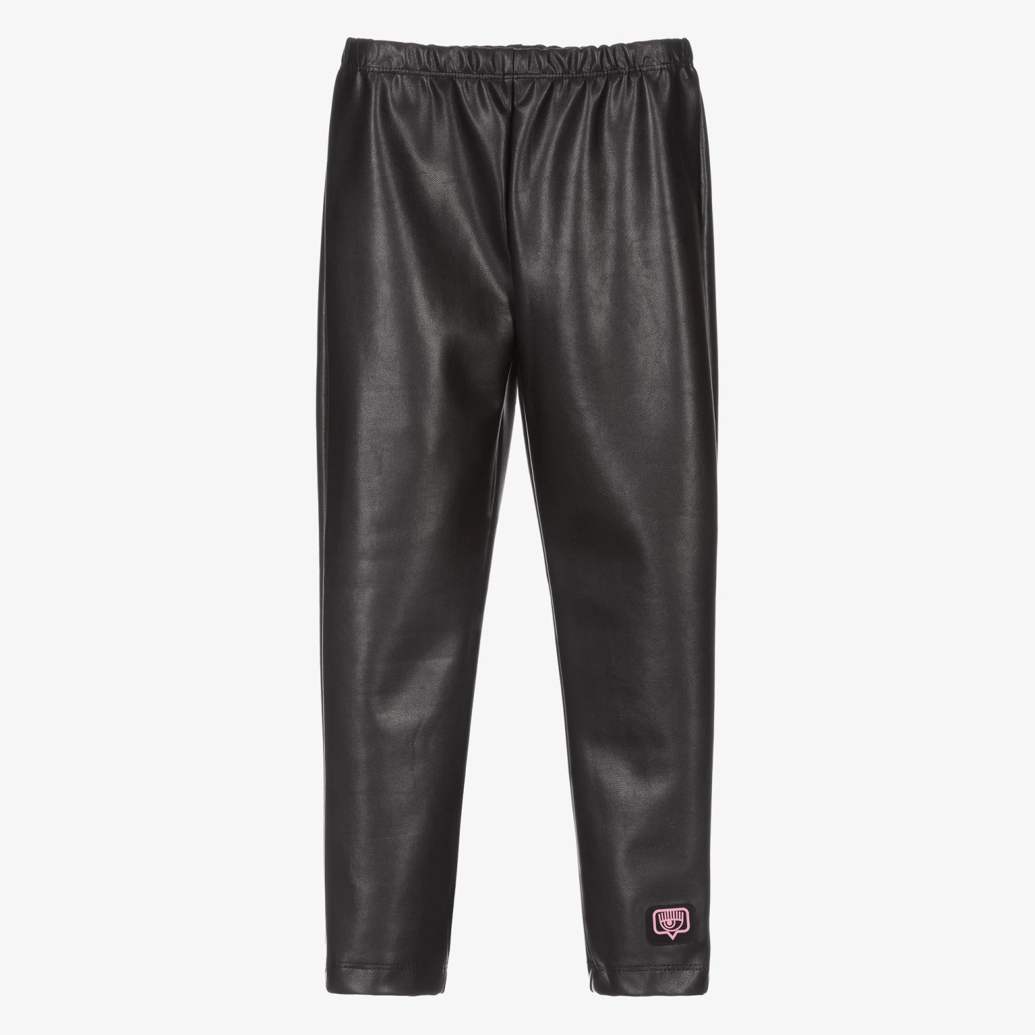 Girls black leggings from Chiara Ferragni Kids, made in soft faux leather for comfortable wear. Fashion forward, they have an elasticated waistband and the designer’s signature Eyelike logo in pink on one ankle.