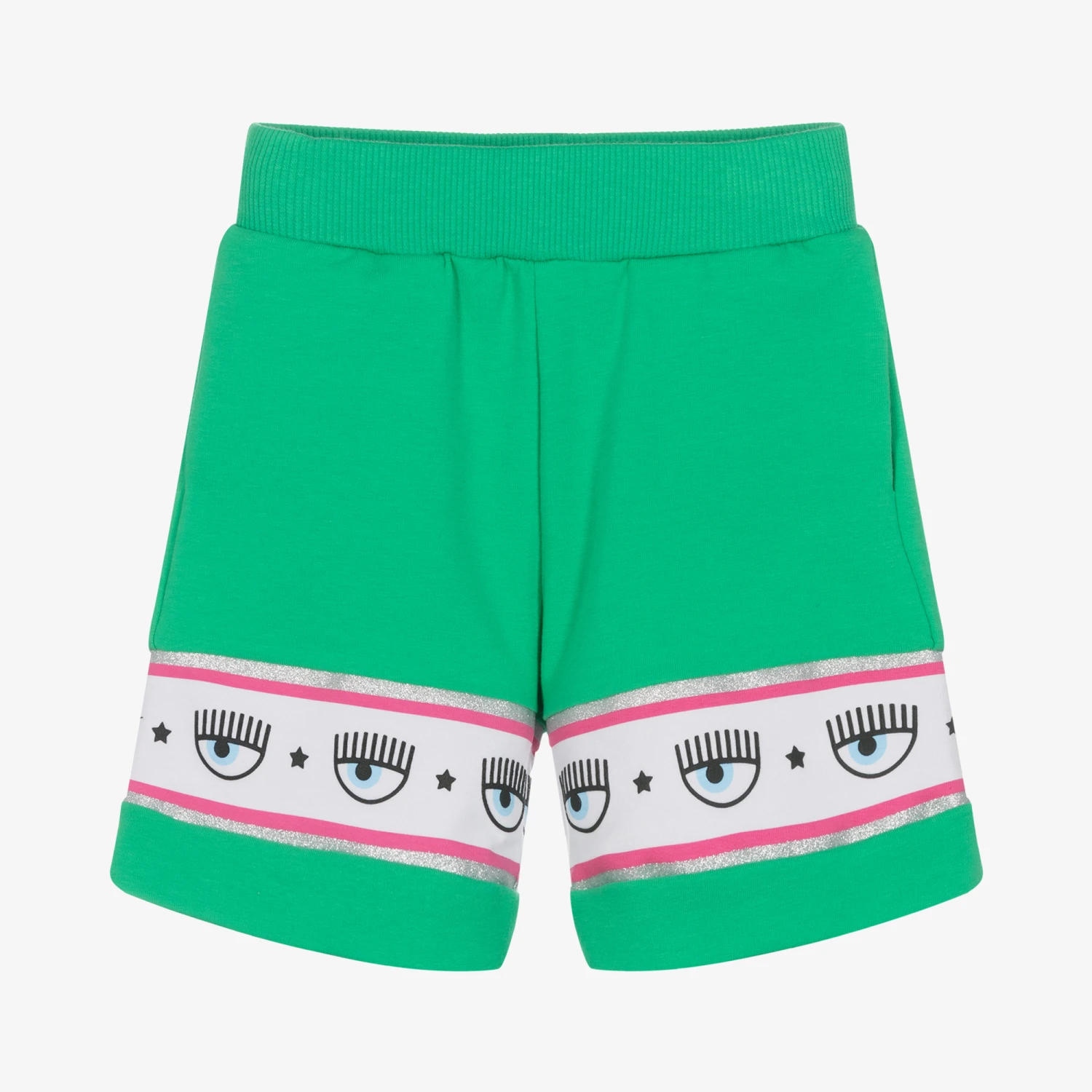 Casual green shorts for girls by Italian designer Chiara Ferragni Kids, made from a soft cotton jersey. Edgy and bold, they feature the brand’s iconic Maxi Logomania design with pink and silver glitter stripes around the leg. They have two side seam pockets and an elasticated waistband for a casual and comfortable fit.