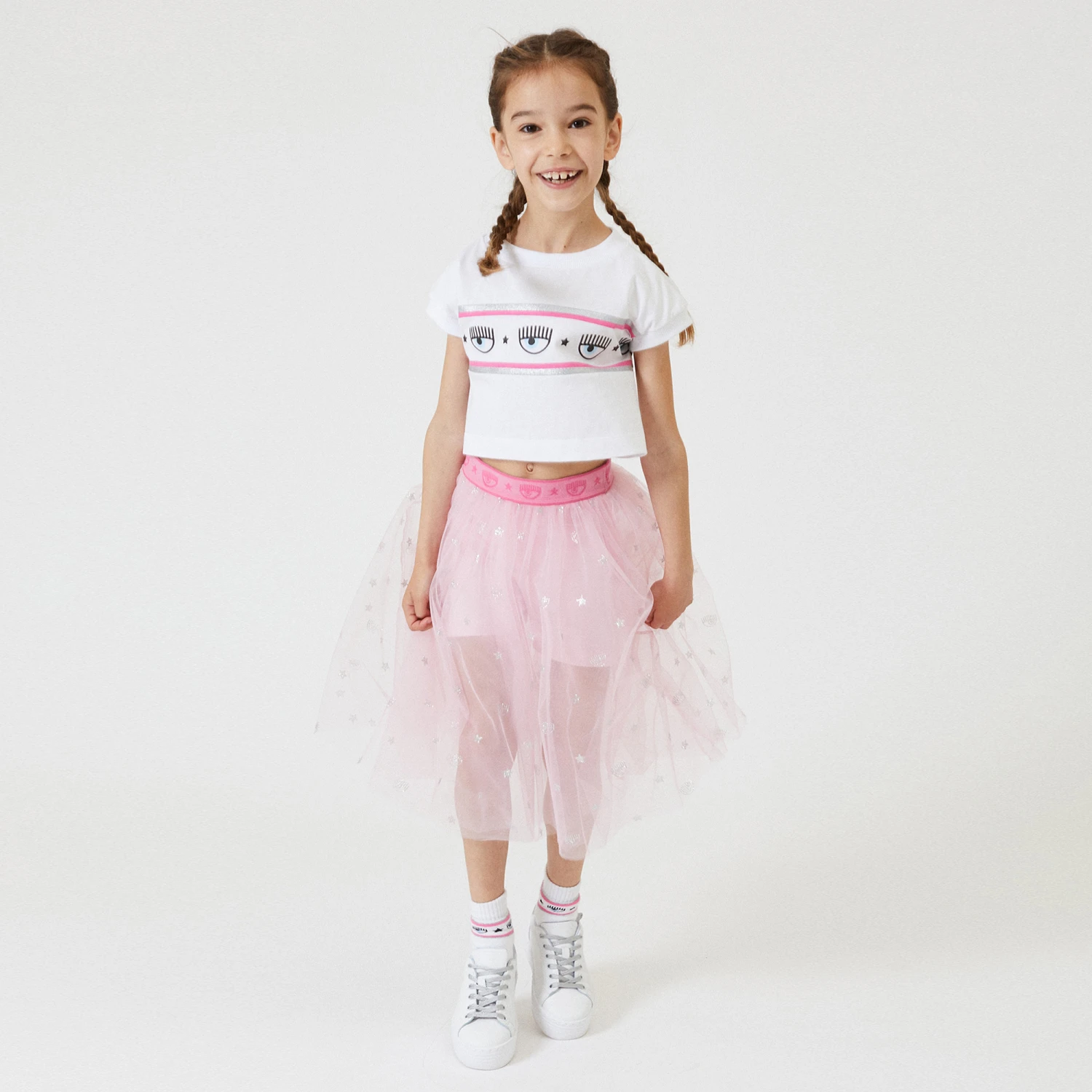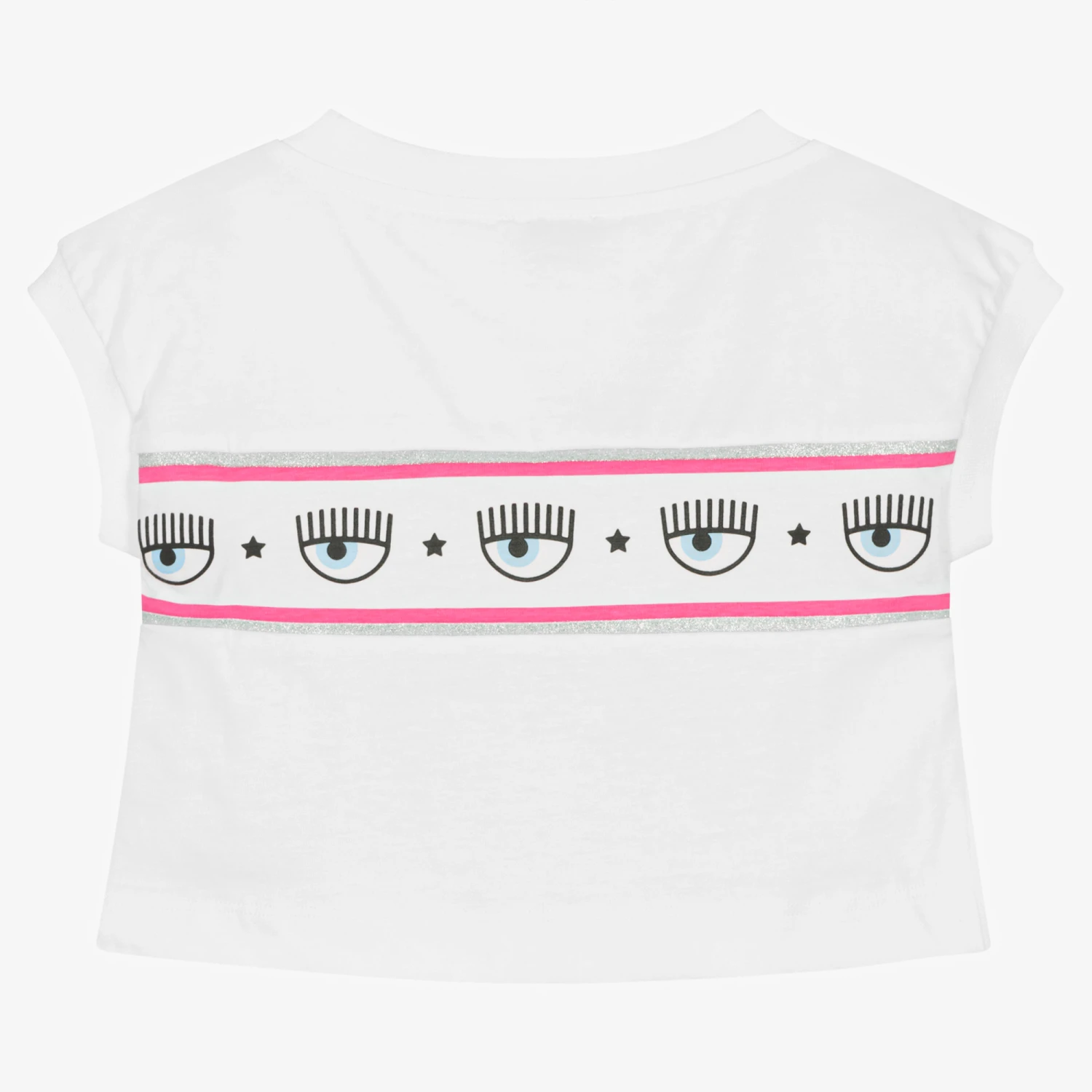 In a cropped boxy style, this white T-shirt for girls is by Italian brand Chiara Ferragni Kids. In an eye-catching design, the brand’s iconic Eyestar logo is repeated across the back and front, with a pink and glittery silver trim. Casual and comfy, the top is made in soft cotton jersey with ribbed trims.